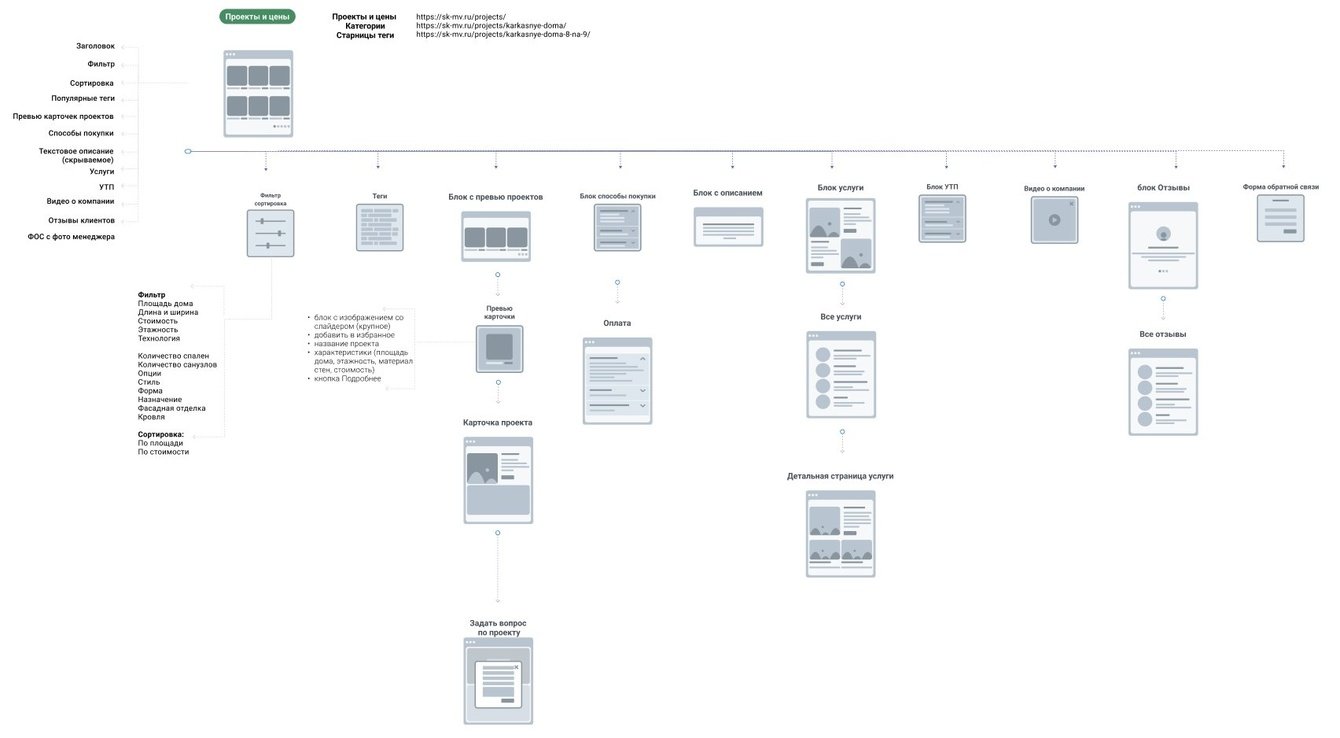 Плюс, наши SEO-специалисты собрали базовое семантическое ядро, описывающее спрос в тематике строительства загородных домов. На основе данной семантики мы составили структуру сайта.