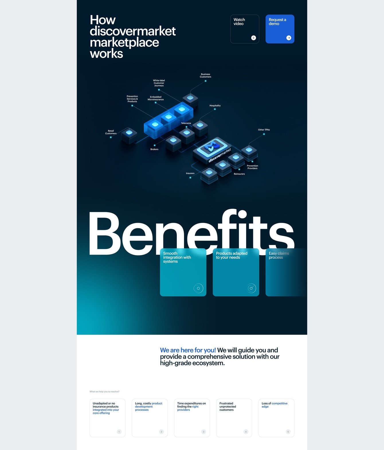 Новаторское, технологичное решение Discovermarket требовало четкого и понятного объяснения для обеих сторон. Изначально компания обратилась к нам за дизайном инфографики, но мы увидели, что прототип их сайта не справляется с ключевой задачей — коммуникацией с аудиторией. Они хорошо понимали свой рынок, но не могли донести свое предложение в сети. Изолированные инфографики не решили бы проблему. Мы предложили Discovermarket целиком переработать портал, и они поддержали наше видение.