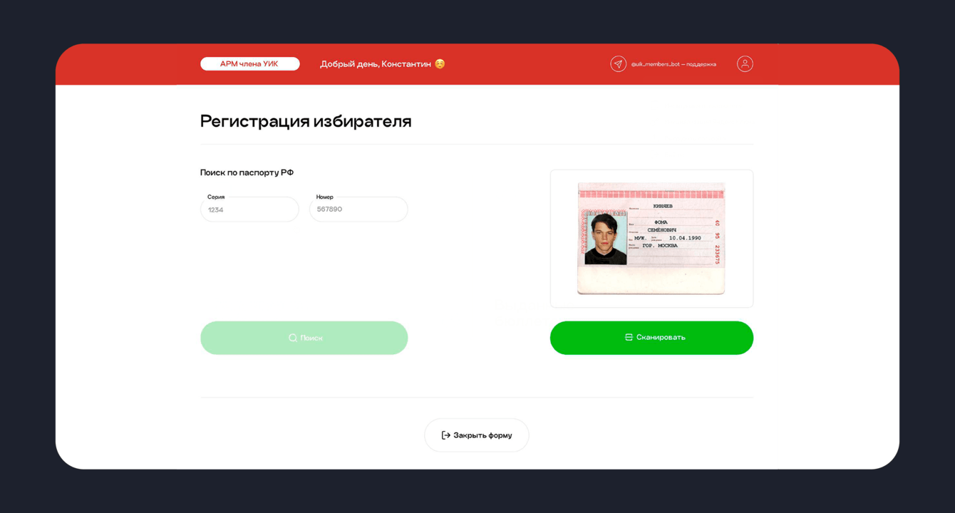 Кроме того, восприятие информации усложнялось из-за перегруженности экранов различными элементами. Один из примеров — экран «Регистрация избирателя». Пользователь видит сразу три кнопки: «Поиск», «Сканировать» и «Закрыть форму». Такое множество вариантов затрудняет понимание того, какое действие необходимо сделать для достижения результата.