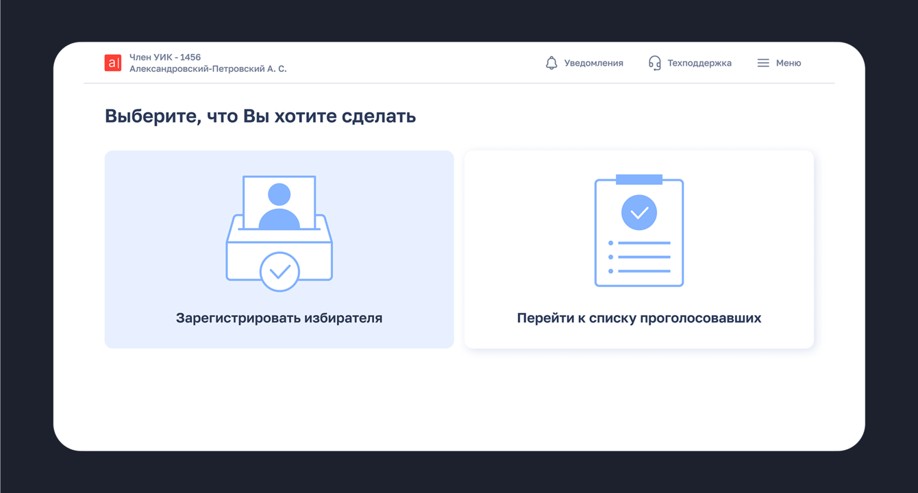Чтобы голосование прошло максимально удобно для избирателей, мы начали работы с создания интуитивно понятного интерфейса сервиса «Электронный список избирателей». Инструмент предназначен для членов избирательной комиссии и направлен на цифровизацию процесса приема голосующих на участках.