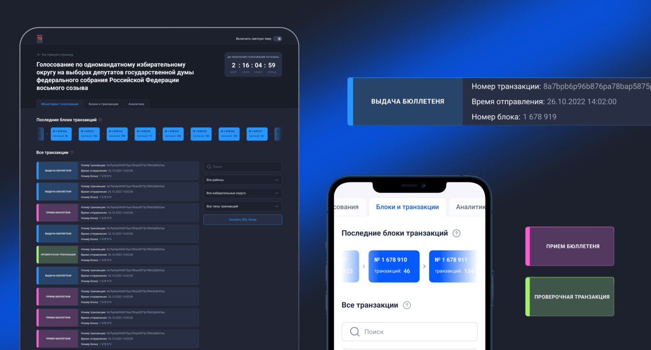 Решение: чтобы подтвердить прозрачность процессов, мы добавили возможность проследить, как происходит транзакция прямо из главного интерфейса. Поскольку любое действие с бюллетенем записывалось в блокчейн, ему присваивался номер и появлялась транзакция. И пользователь может запустить проверочную транзакцию, чтобы убедиться в прозрачности процессов. Это возможно было сделать со специального устройства в двух штабах.