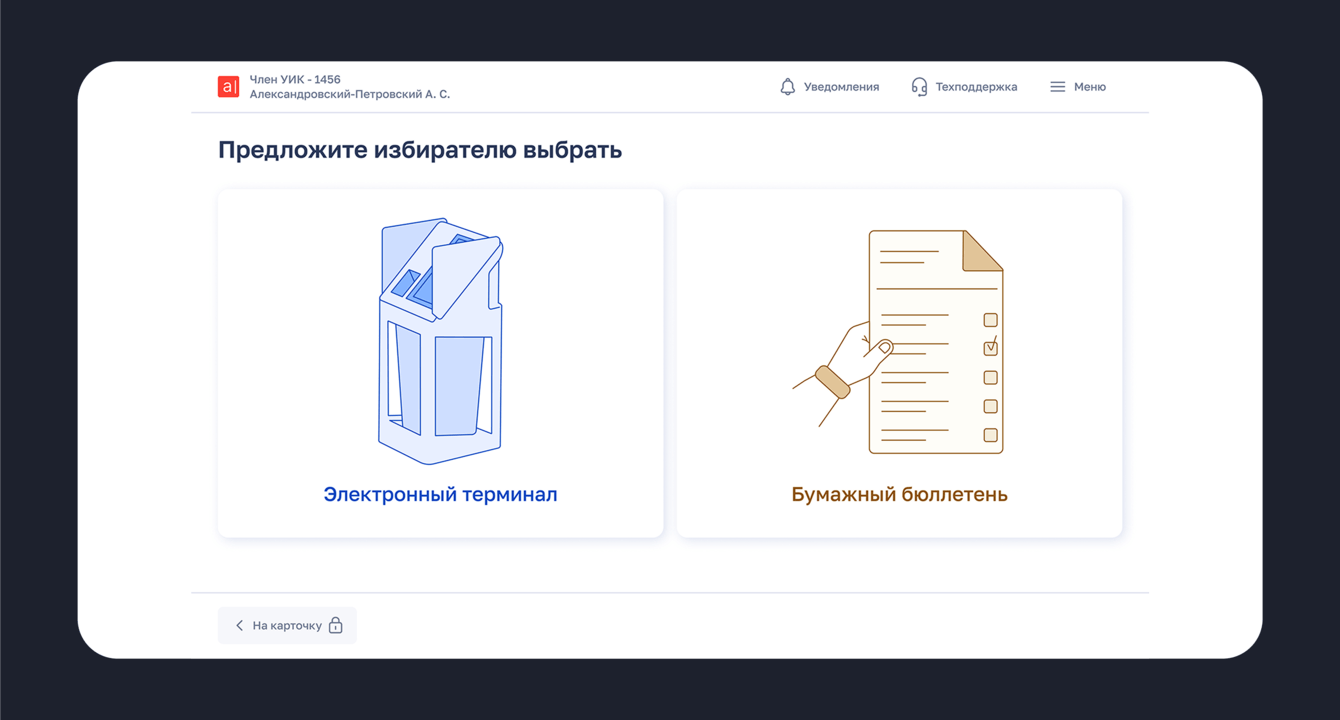 Так, карточку с электронной версией в терминале мы обозначили синим, поскольку синий — цвет технологий. А для классического бюллетеня выбрали бежевый, который ассоциируется с цветом бумаги.