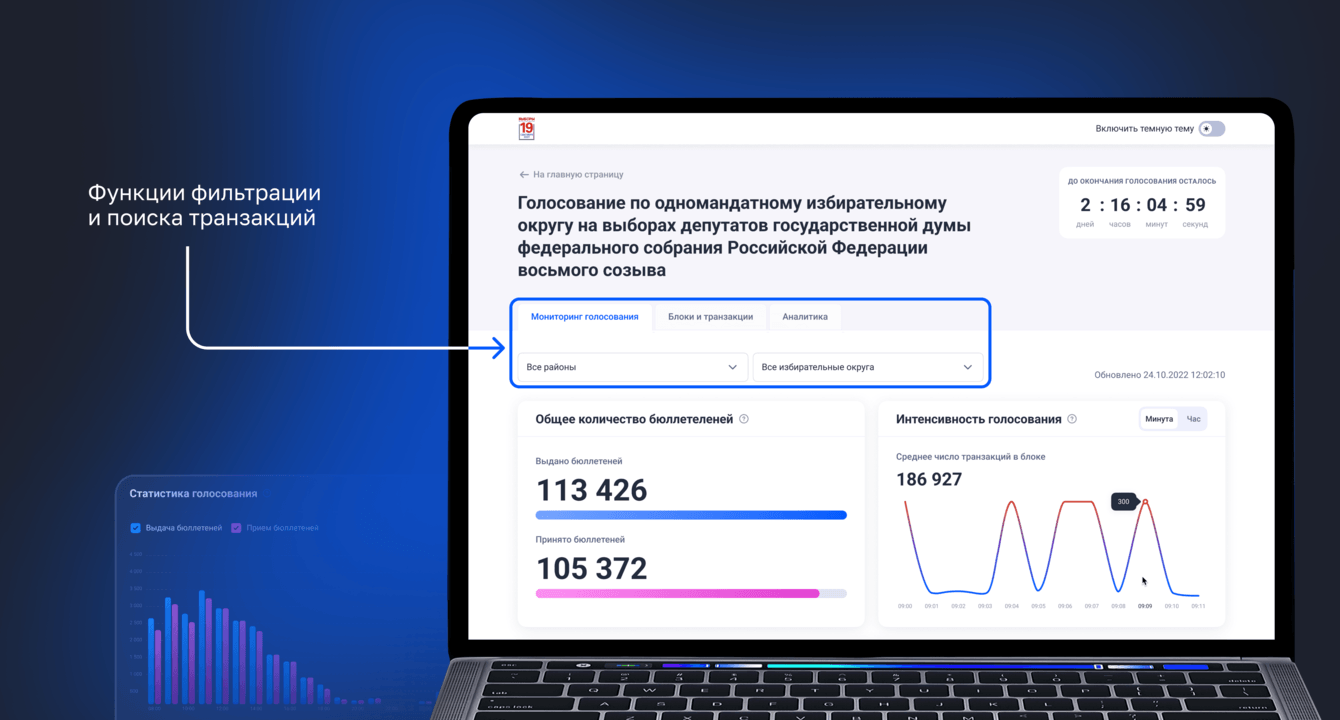 Чтобы избиратели, наблюдатели и сотрудники МГИК могли быстро интерпретировать информацию о ходе онлайн-голосования, мы разработали интерфейс сервиса «Обзервер». Сам инструмент предназначен для мониторинга хода дистанционного электронного голосования с помощью блокчейн-сети, в которой хранится информация о всех действиях, с ним связанных: это сведения о выдаче электронных бюллетеней, получении голосов, их расшифровке и подсчете. Эти данные находятся в открытом доступе и показывают динамику голосования.