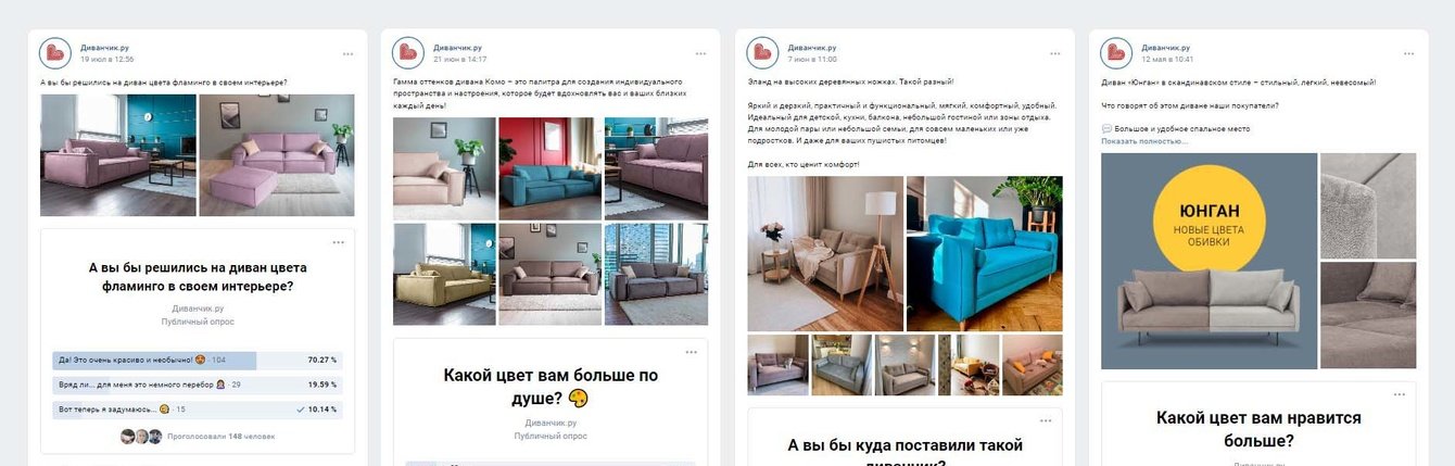 Для «включения» новых подписчиков в бренд на их пути к покупке дивана, на регулярной основе публиковали полезный контент. Так как диван сложно выбрать вслепую, мы сделали упор на: