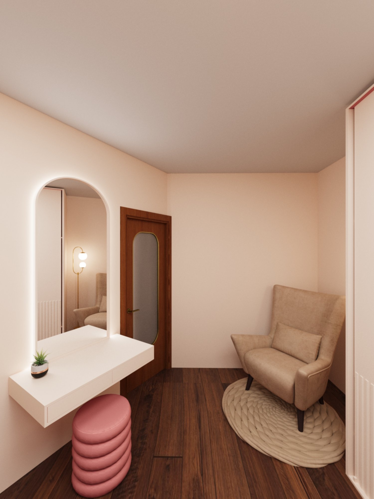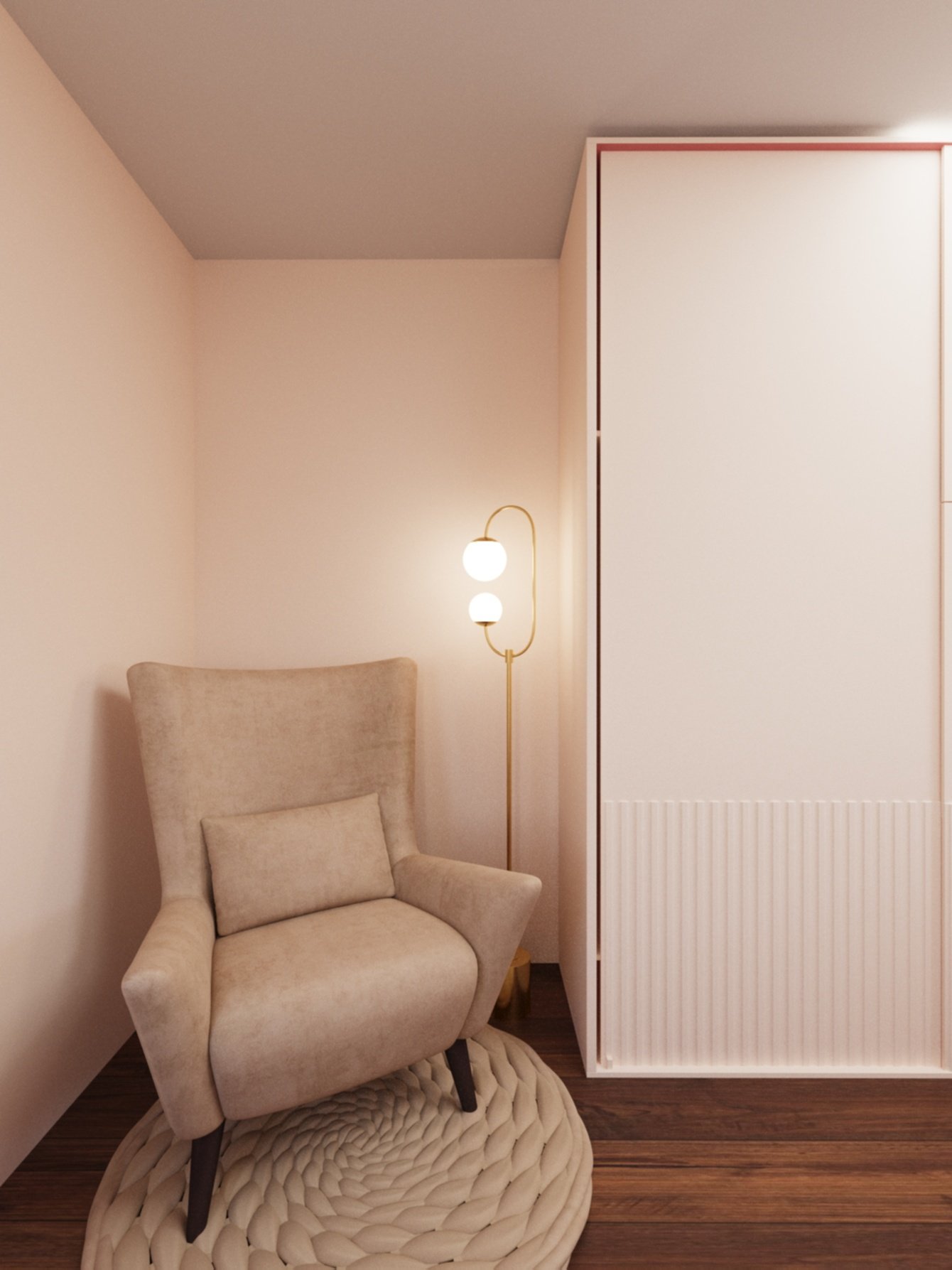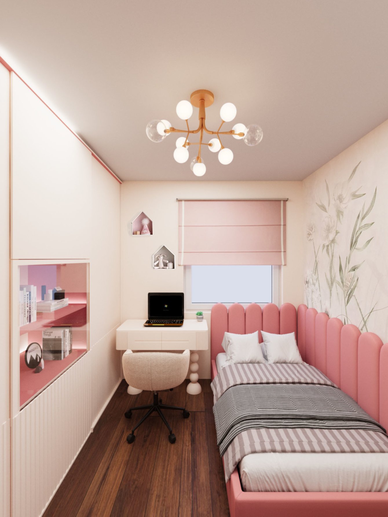 На основе технического задания разработали дизайн-проект и фотореалистичную визуализацию детской комнаты в уютной палитре розовых и светлых оттенков.