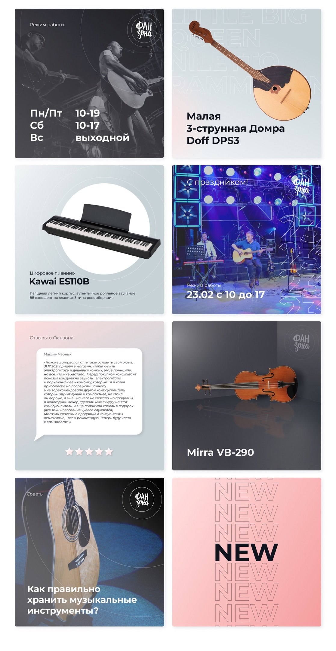 Фанзона продает не только музыкальные инструменты, а еще звуковое и световое оборудование. Общее между звуком и светом — это волна, которую издает звук и излучает свет. Этот образ стал основой концепции.