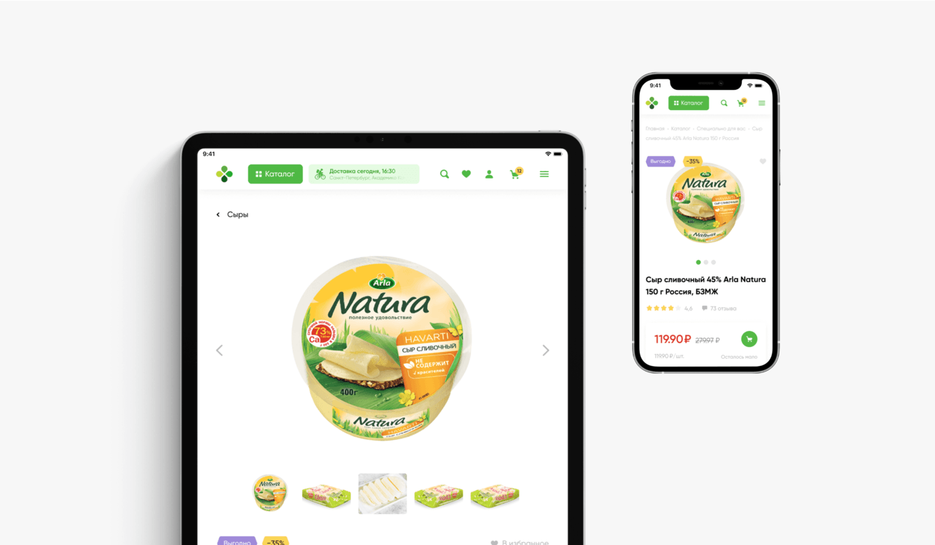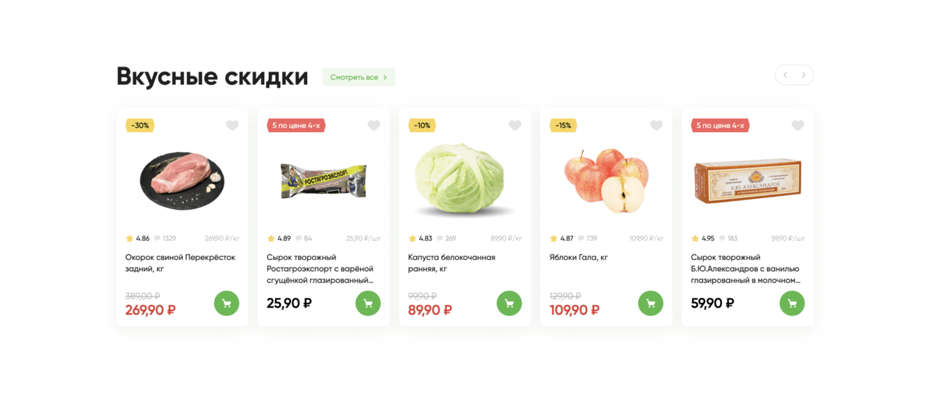 В процессе предпроектного исследования и из данных аналитики за прошлые годы мы выяснили, что больше 70% клиентов сначала добавляют в корзину продукты по скидке, а уже потом — из основного каталога. Еще один важный вывод — пользователи часто готовы купить в 2 раза больше товаров, если на них есть скидка.