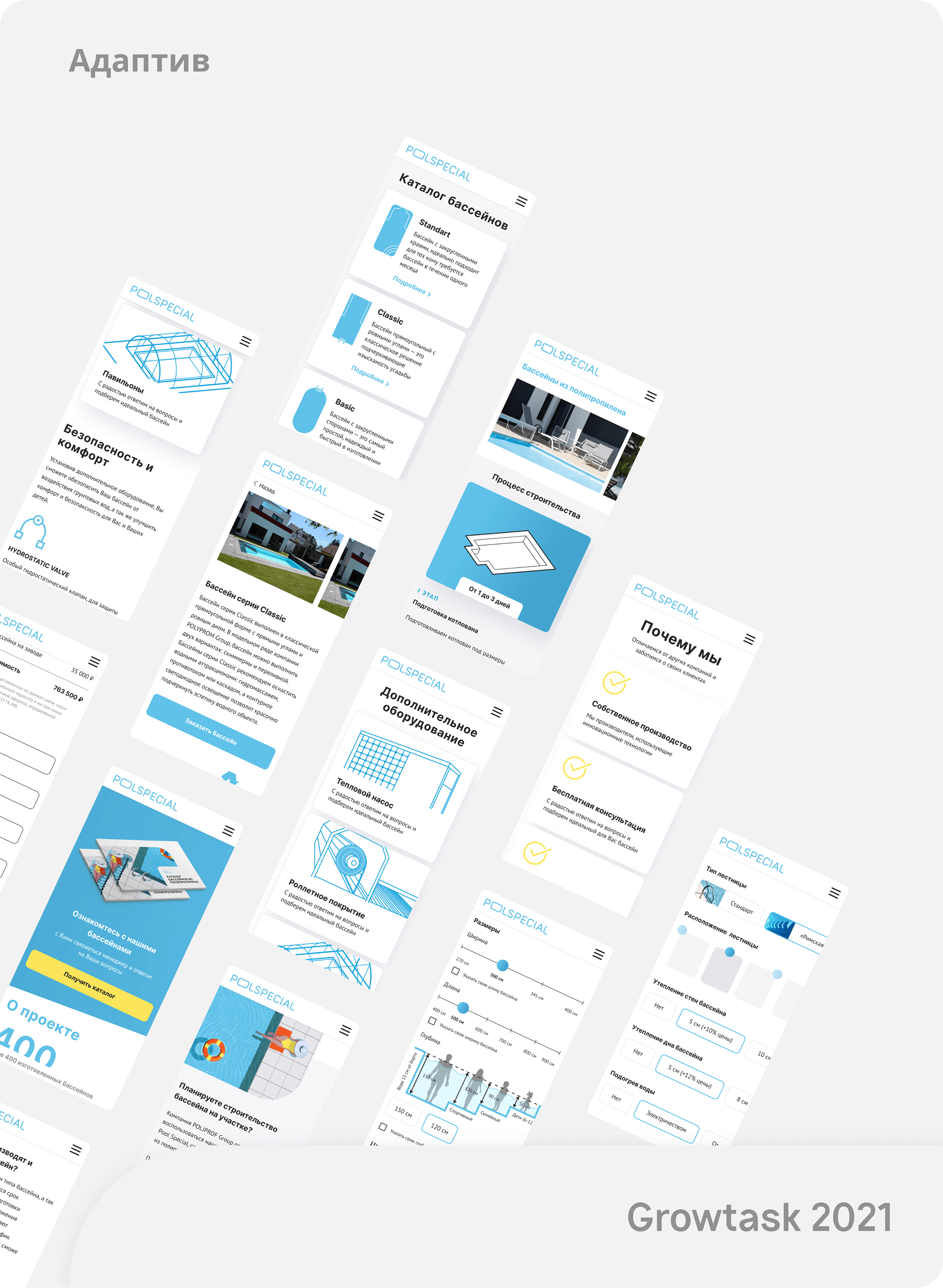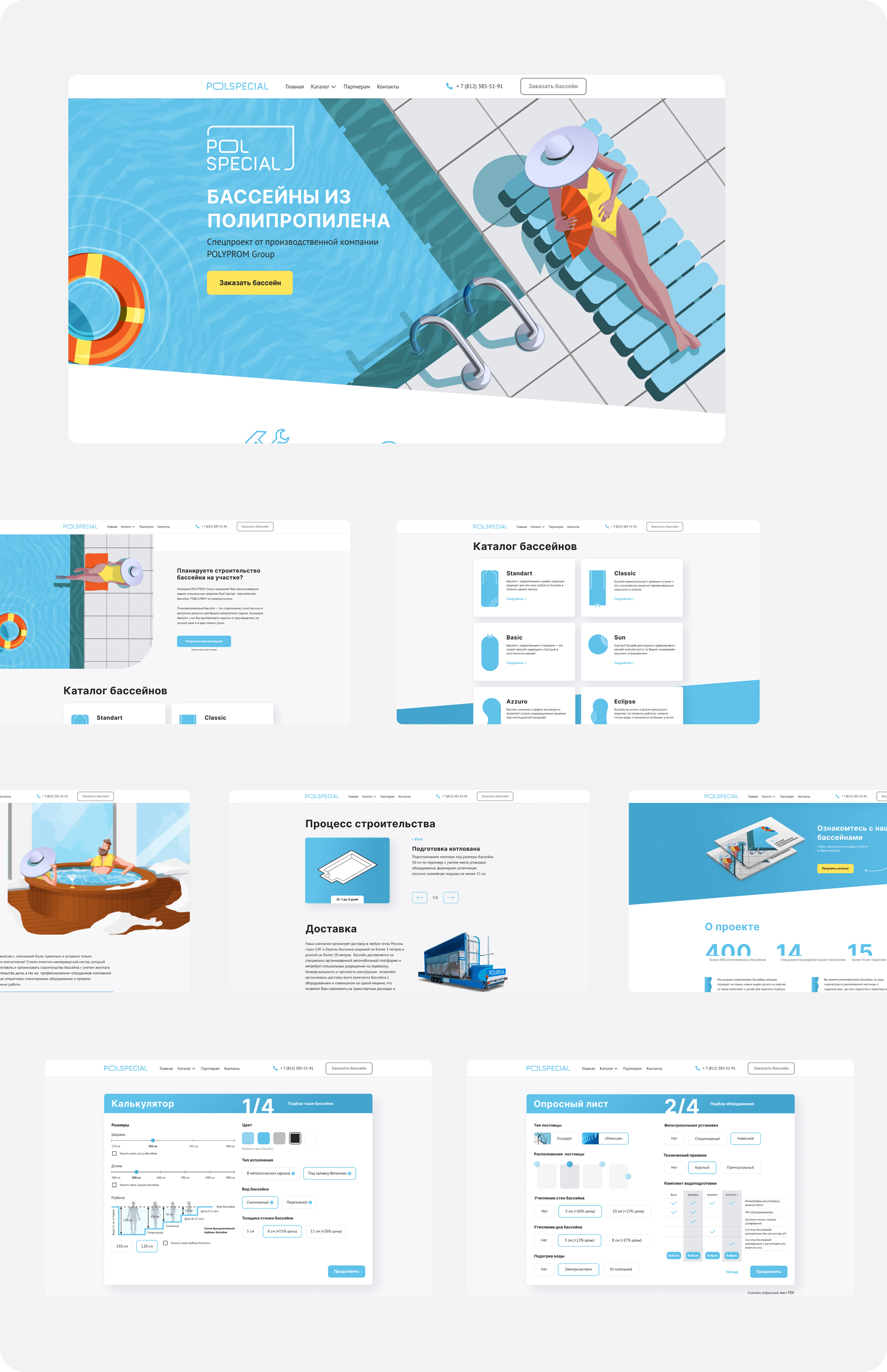 Сайт рассказывает о продукте: как получить, отличия и конкурентные преимущества. Также на сайте можно выбрать бассейн, узнать как он работает и скачать схему работы, можно выбрать конфигурацию и рассчитать стоимость готового бассейна с помощью калькулятору.
