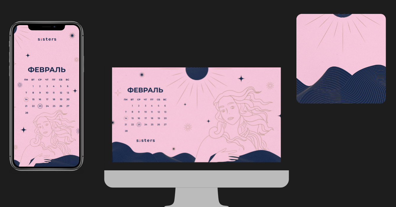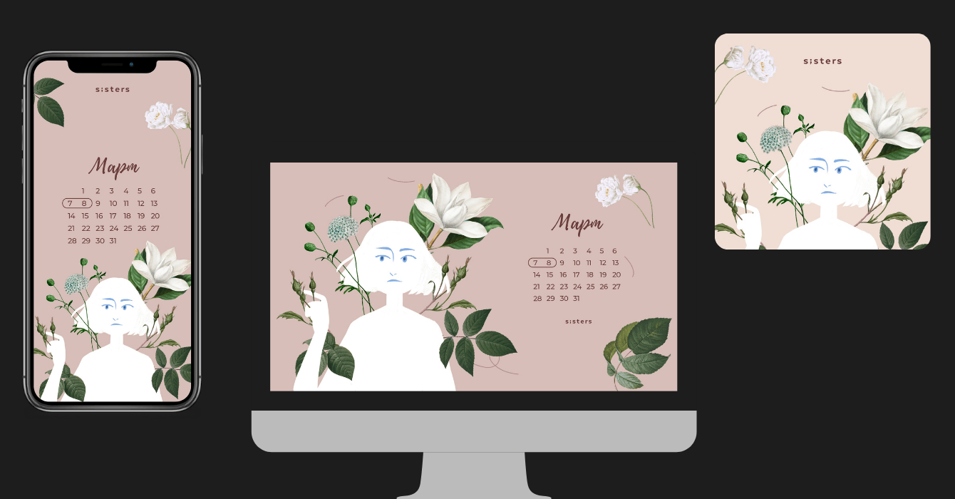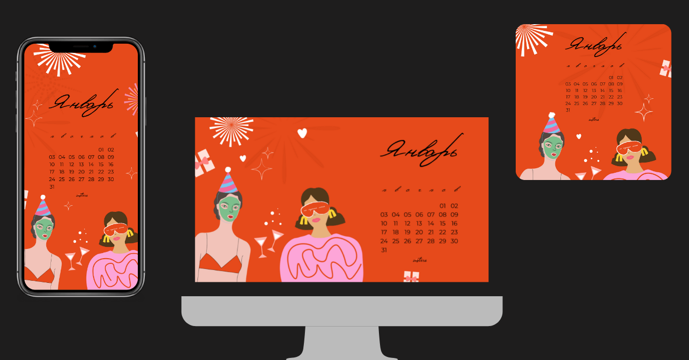 В рамках проекта каждый месяц были отрисованы иллюстрации для обоев-календарей для электронных устройств. Каждый месяц отличался тематикой иллюстраций – от шумного и искрящегося Нового Года до весеннего и романтичного марта.