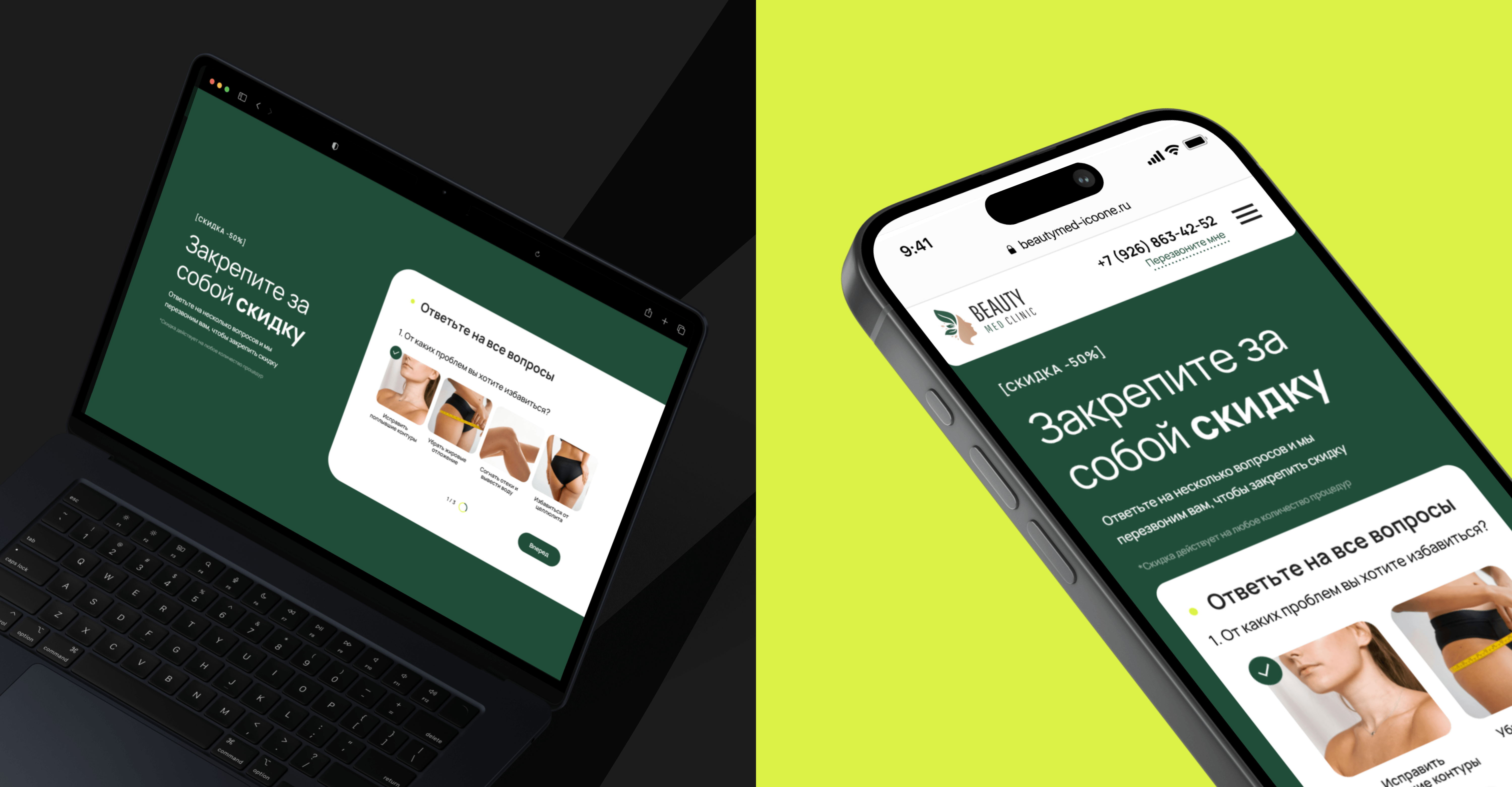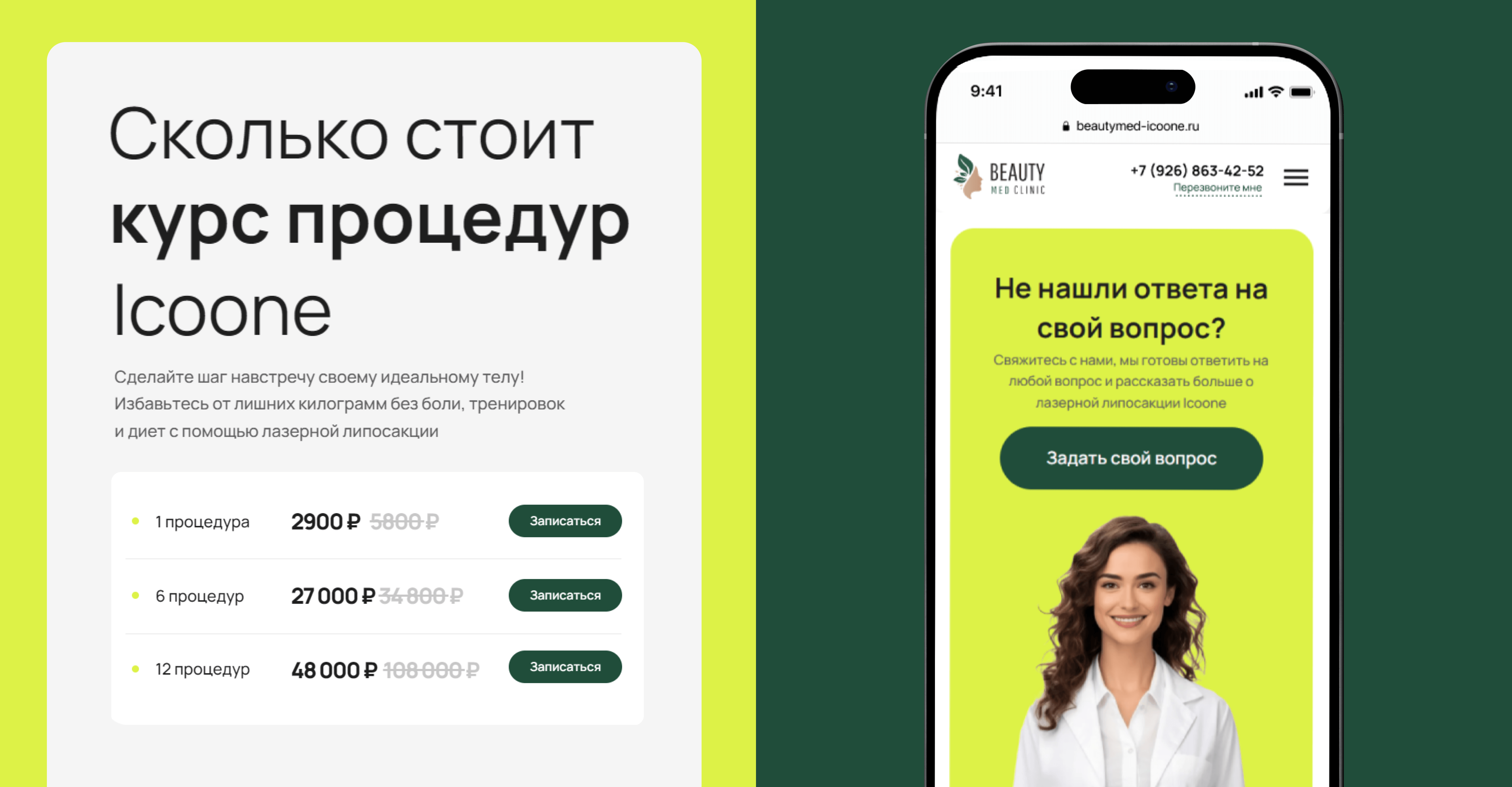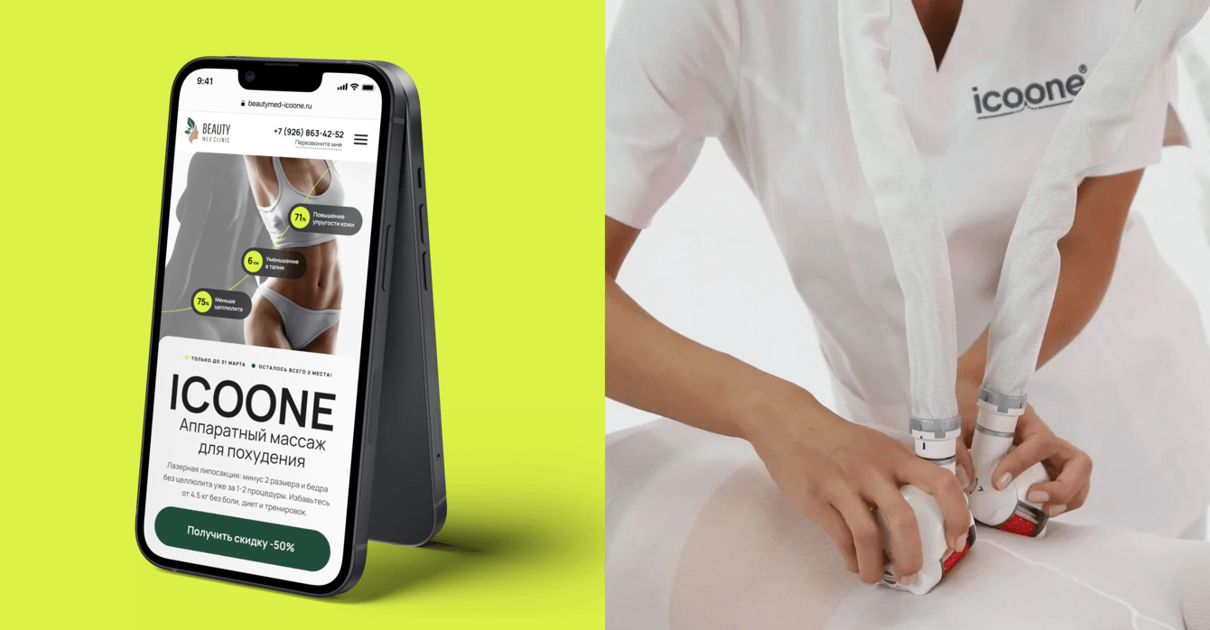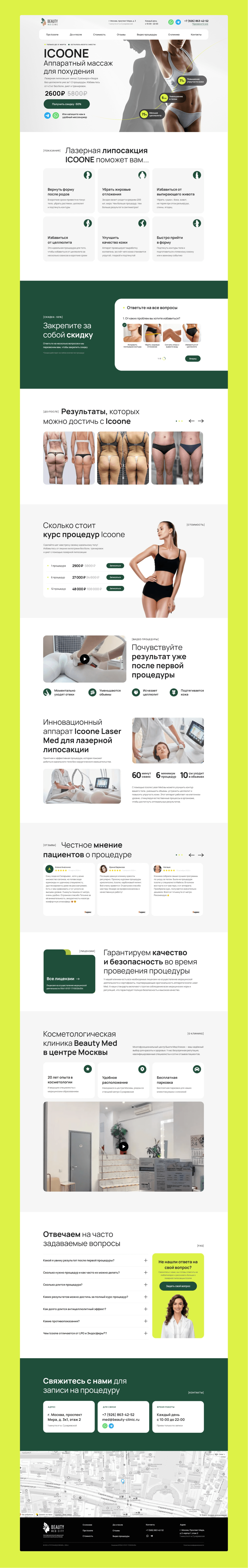 Сделать дизайн и разработать лендинг для привличения клиентов на запись на аппаратный массаж ICOONE в московской клинике Beauty Med Clinic.