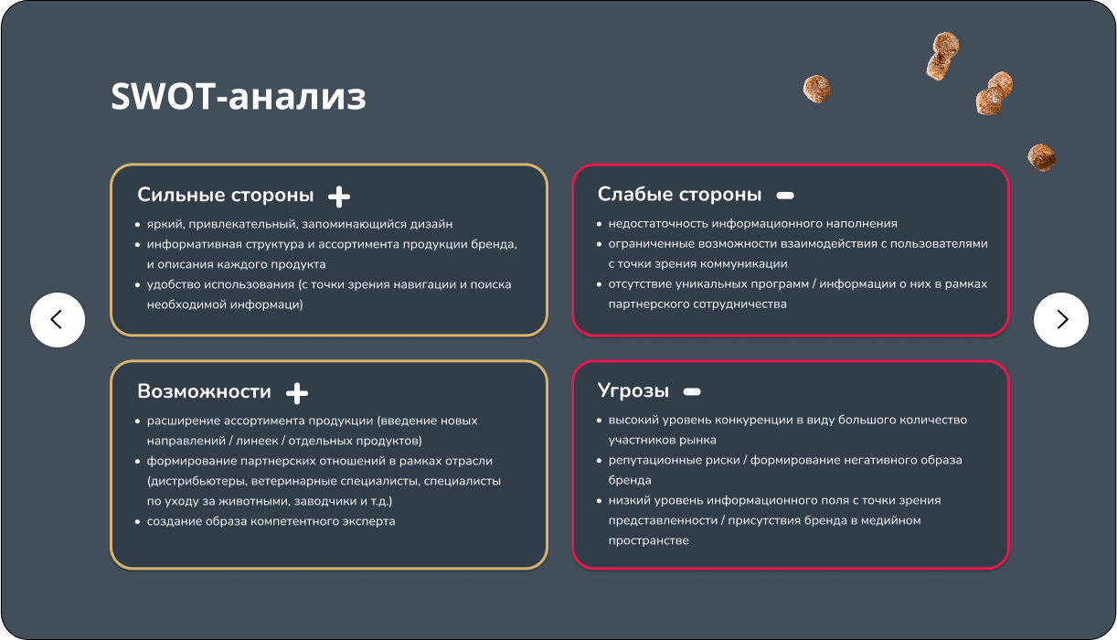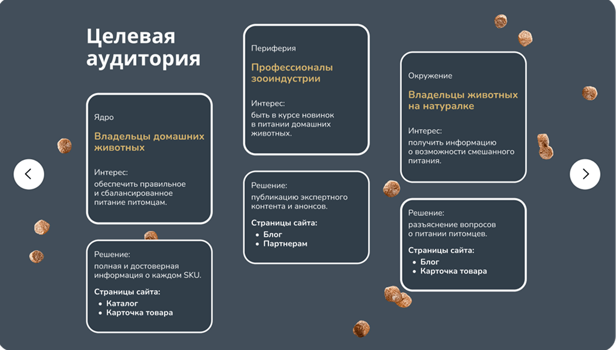 Одной из ключевых идей для дальнейшего развития стала концепция очеловечивания и персонализации образов питомцев. Мы поставили перед собой цель усилить эмоциональную связь с пользователями, сделав питомцев центральными персонажами сайта, а не просто фоном для демонстрации корма. Каждый герой получил свое уникальное имя, историю, характер и даже предпочтения в выборе корма. Такой подход позволил бы создать более глубокий и личный контакт с аудиторией, давая ощущение заботы и внимания к своим любимцам.