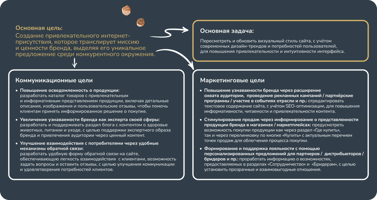 Основная задача стала для нас отправной точкой при проектировании. Мы декомпозировали основную цель на второстепенные: коммуникационные и маркетинговые, и сформулировали ряд задач, направленных на их достижение.