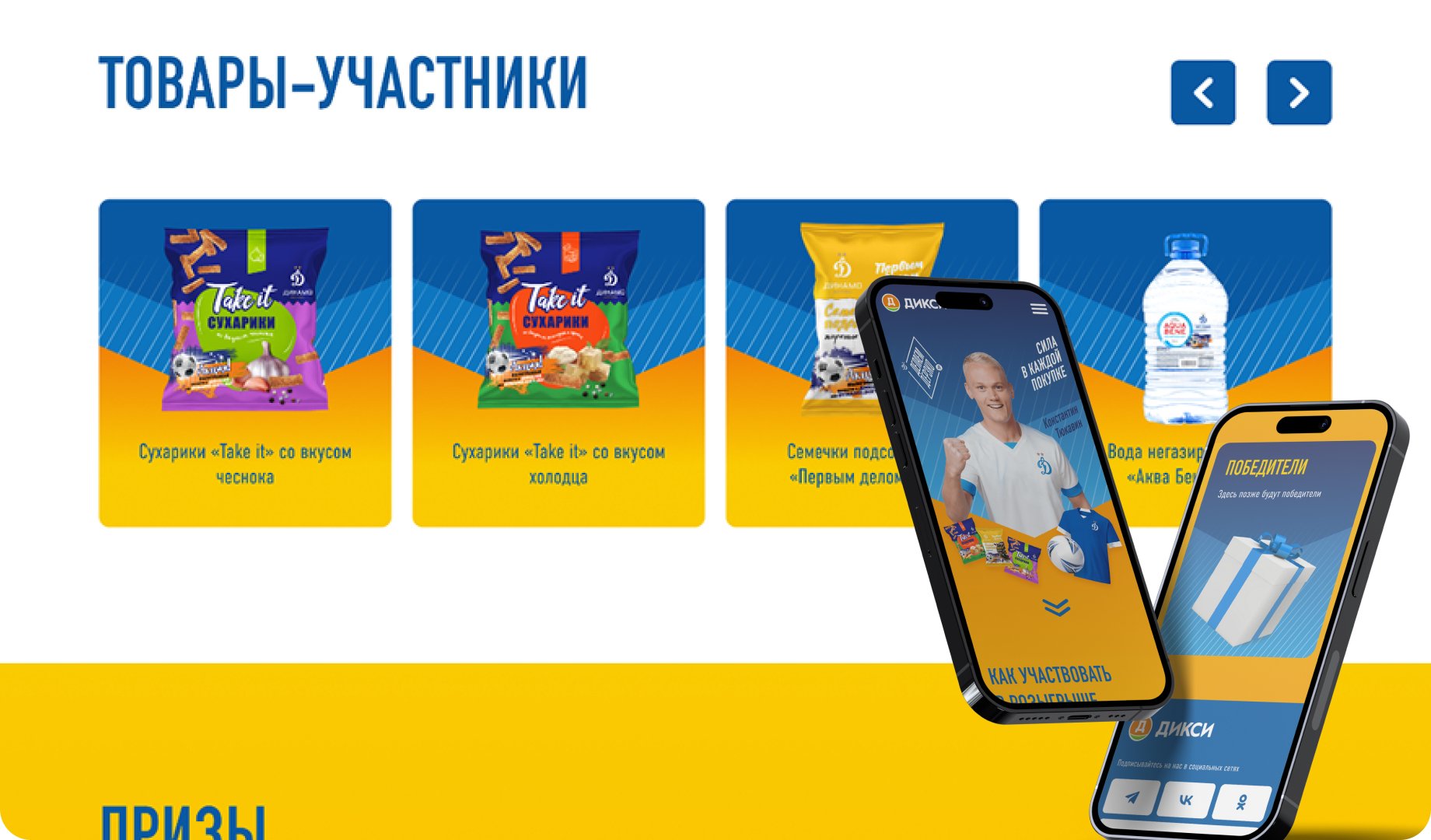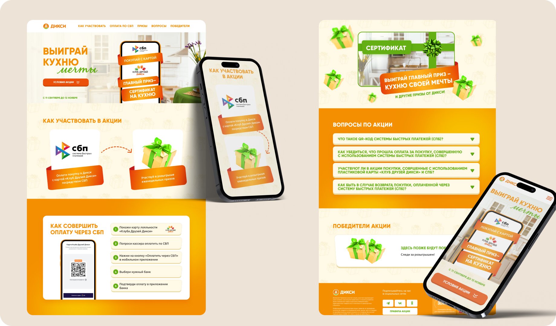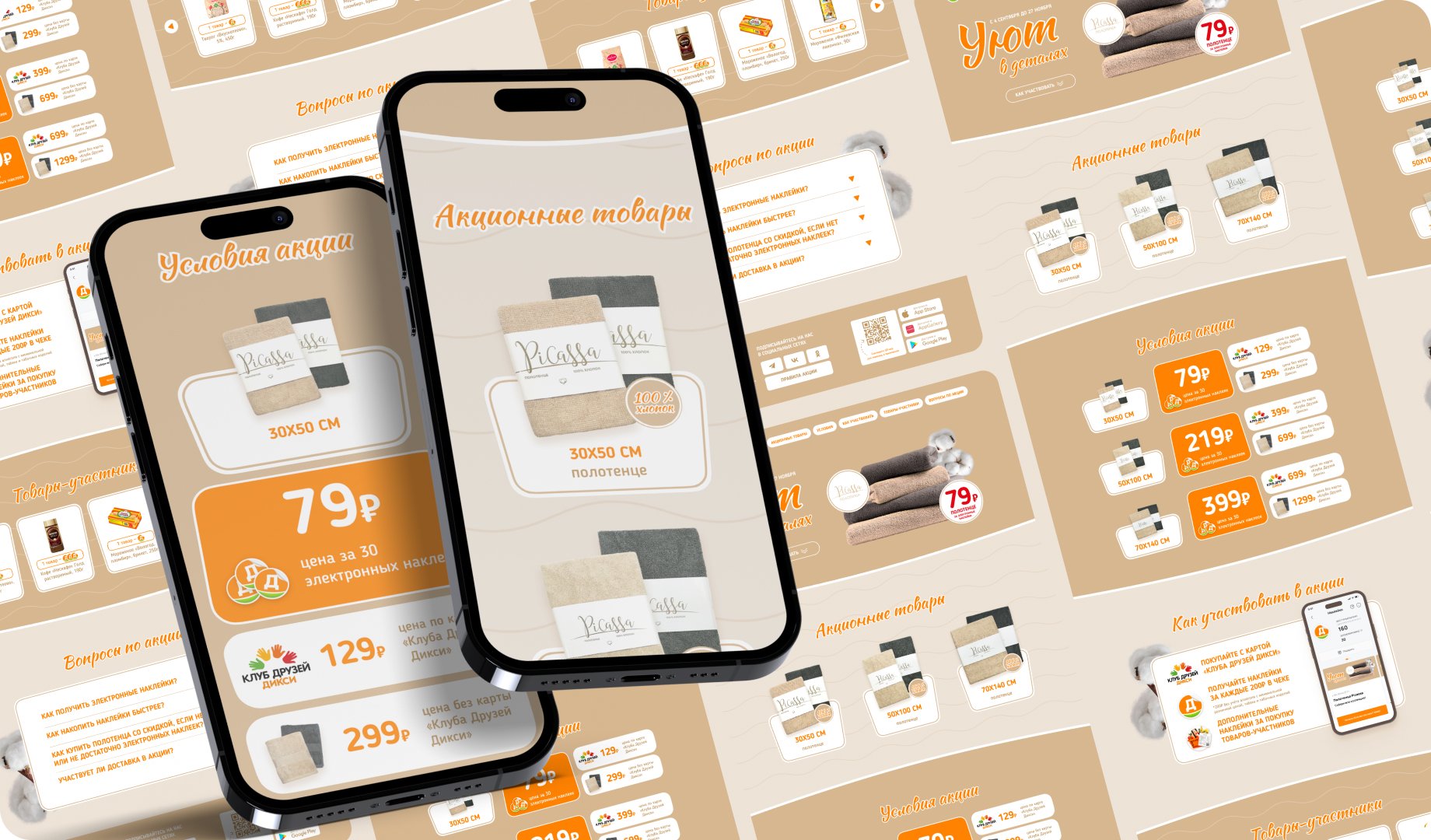 Разработать серию продающих лендингов для промоакций, которые проходили в магазинах "Дикси". Основная цель — привлечь внимание аудитории, повысить вовлеченность и увеличить продажи товаров, участвующих в акциях