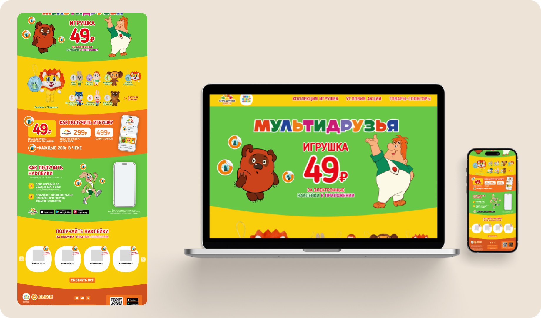 Мы уделили особое внимание визуальной иерархии, чтобы ключевая информация (скидки, акционные товары, сроки акции) сразу бросалась в глаза. Использовали анимации и интерактивные элементы для повышения вовлеченности.