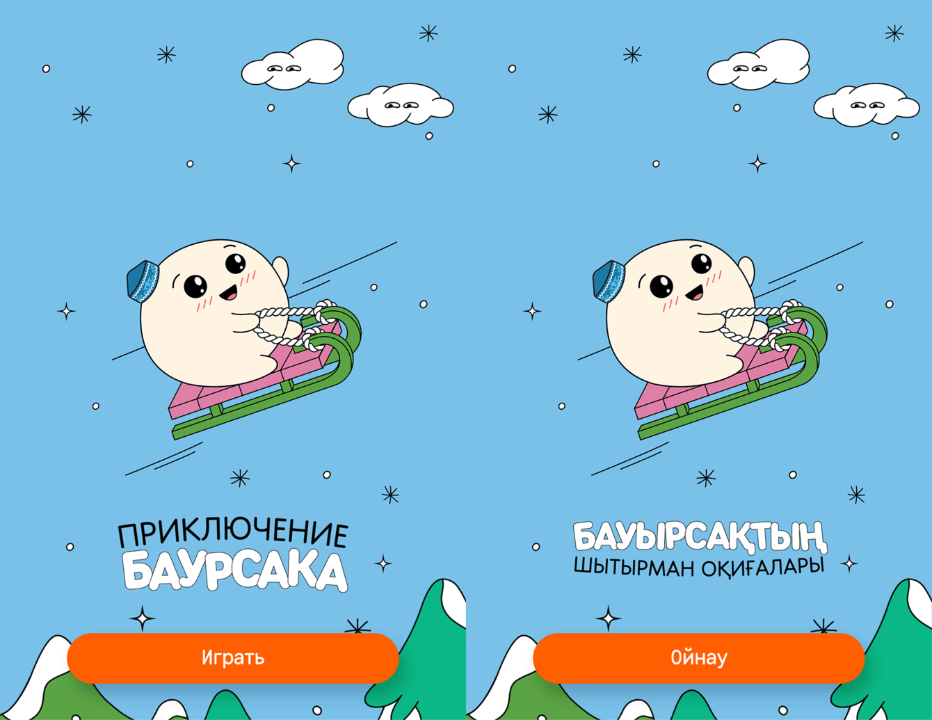Кроме набора графических элементов, наша команда взяла на себя дизайн экранов для презентации игры, оформления баннеров в приложении и игровых экранов на русском и казахском языках.