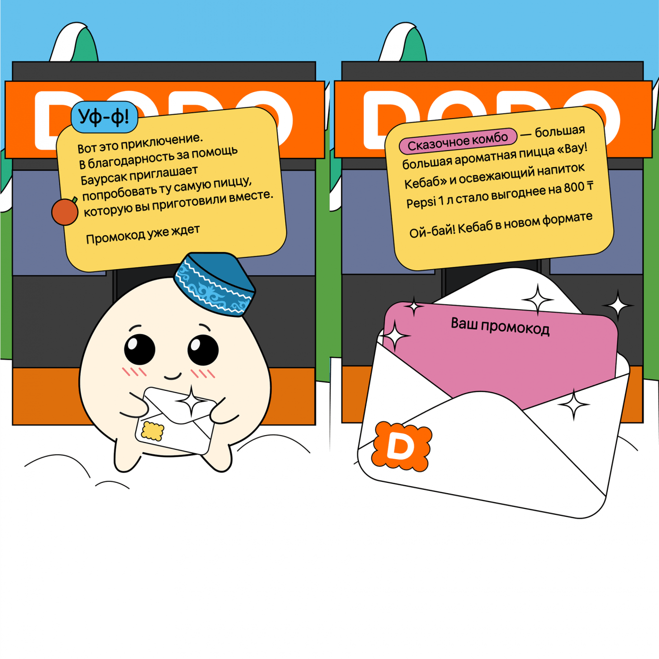 Мы разработали персонажей, фоны, дизайны экранов для презентации и анонса игры, игровые экраны и баннеры, используемые внутри приложения Dodo. Материалы создавались сразу на двух языках — русском и казахском.