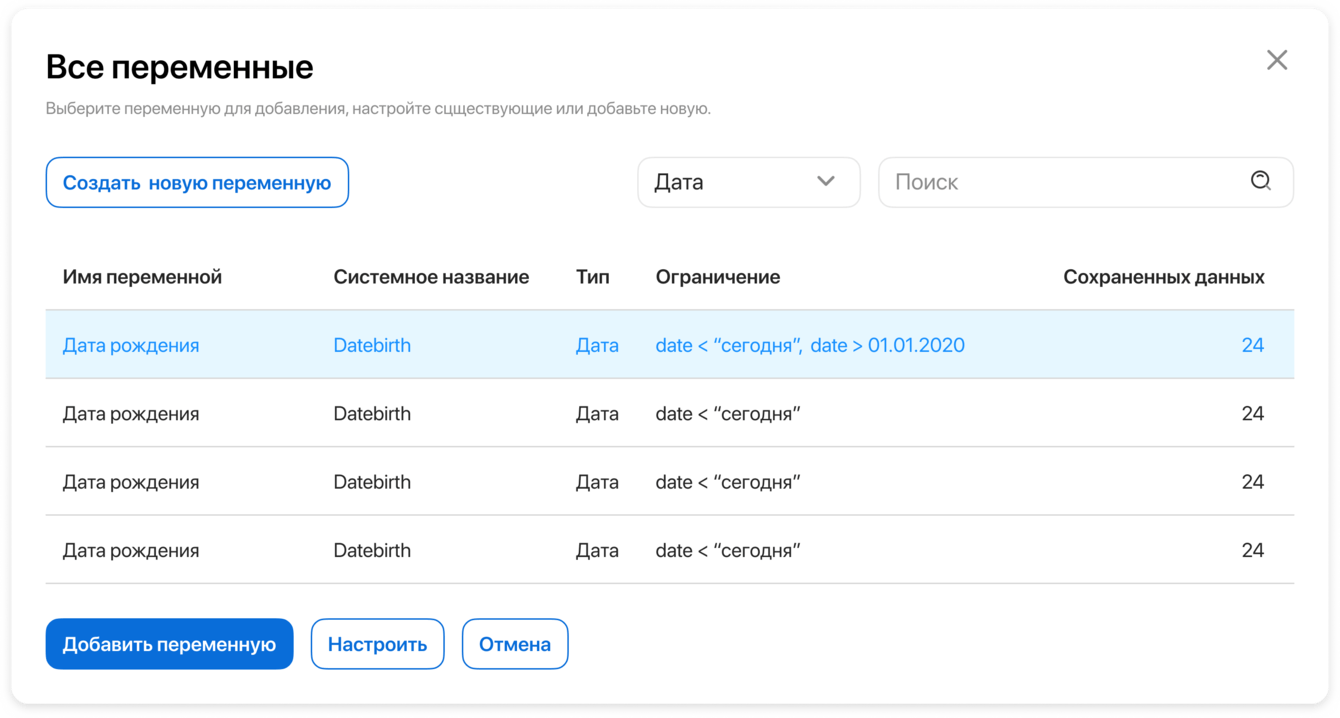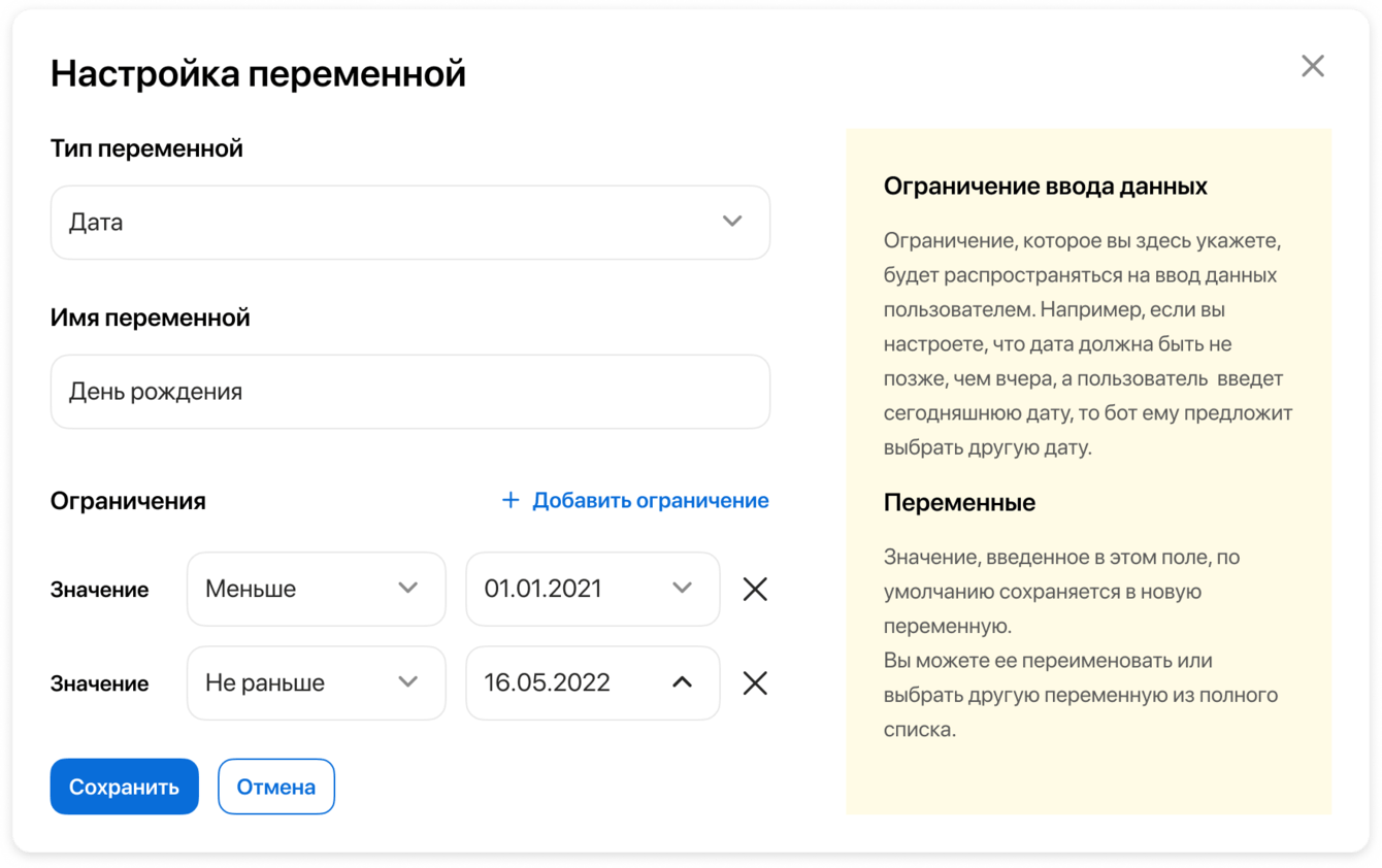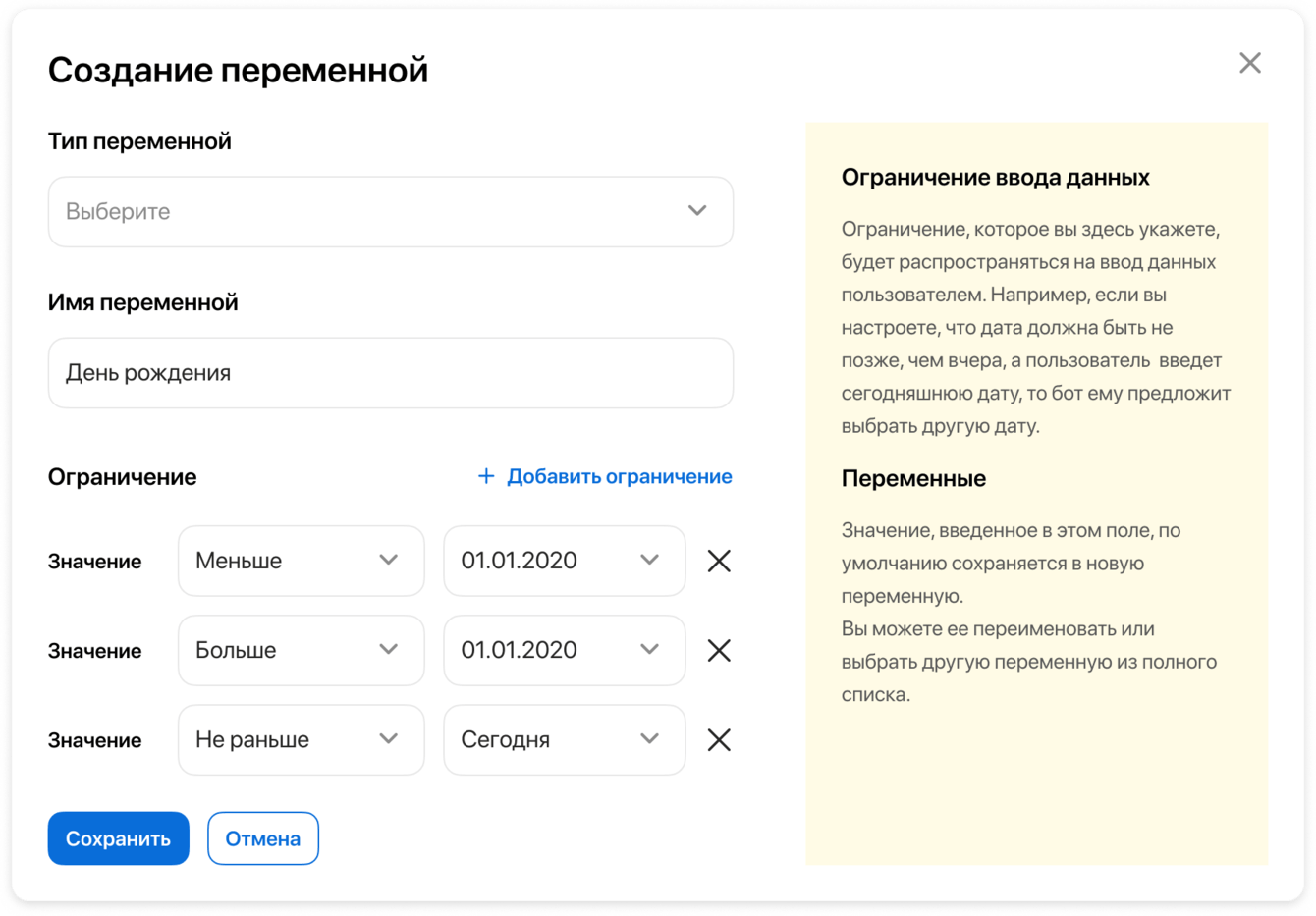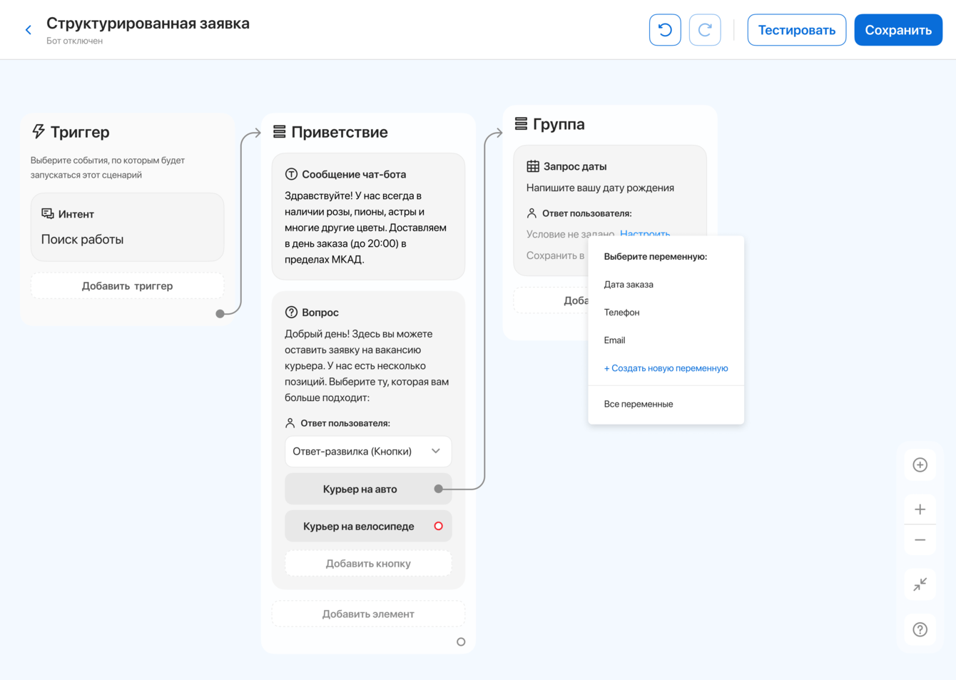 Чат-бот должен не только спрашивать, но и запоминать. Например, дата доставки товара должна не просто отобразиться, а передаваться в CRM. Мы разработали интерфейс и для этой части — ввода и использования переменных.