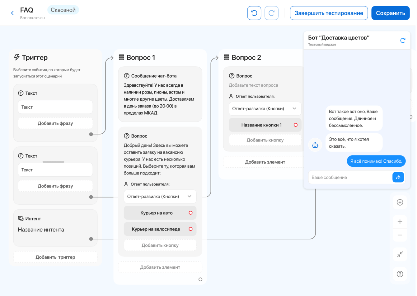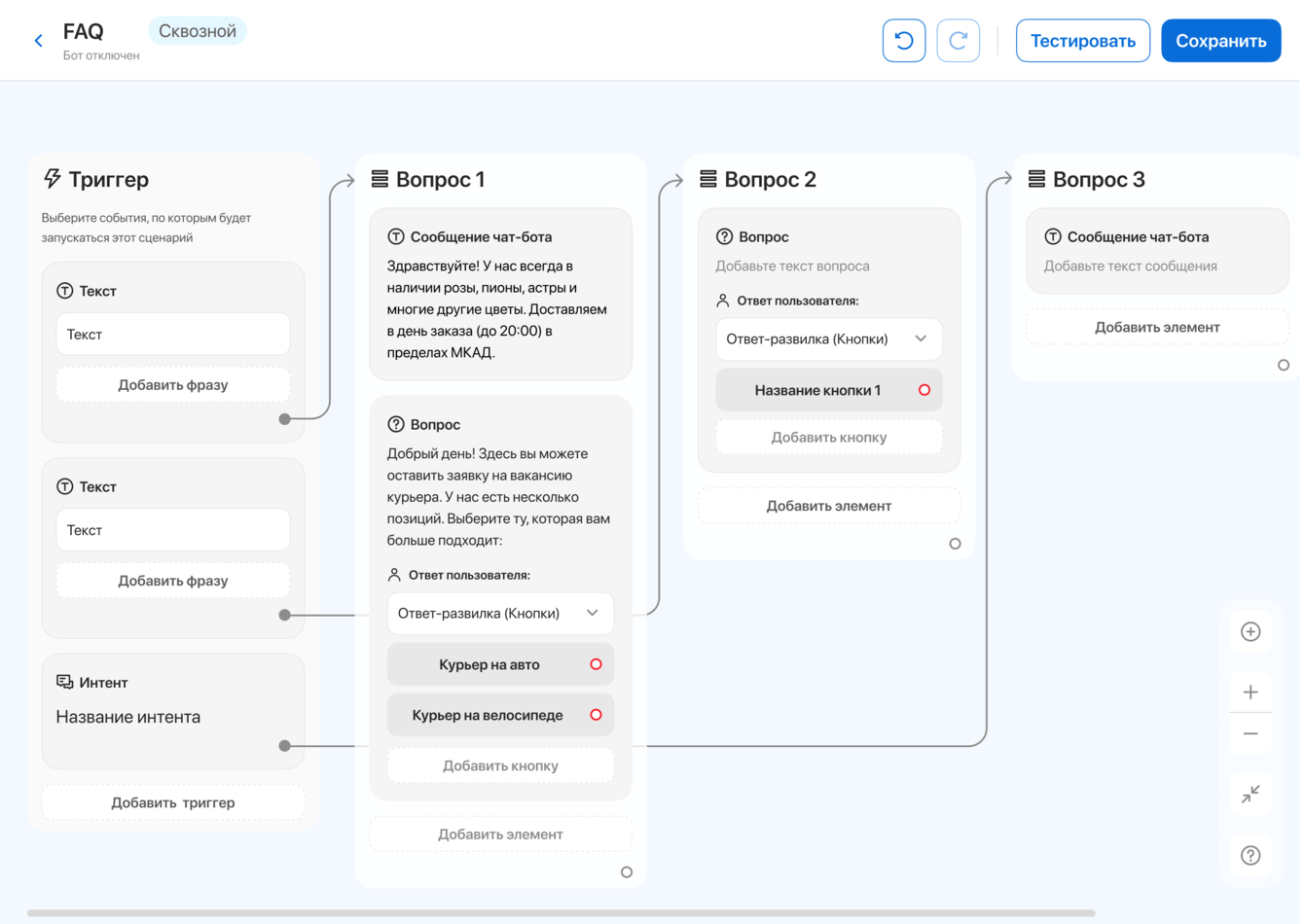 Мы не изобретали жанр. Конструкторы чат-ботов — продукт не новый. Есть множество решений с огромным количеством функций. Мы изучили, какие подходы работают, и взяли оттуда полезное.