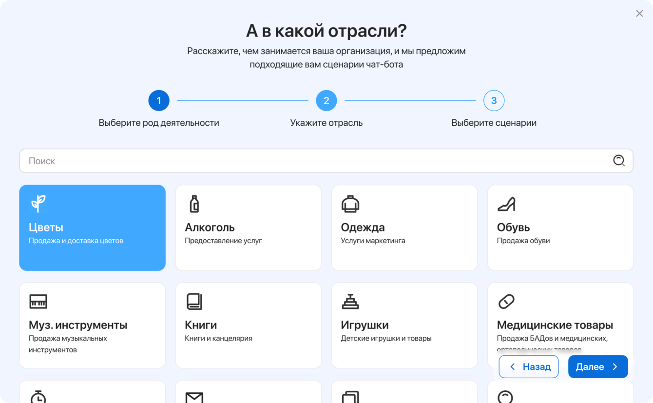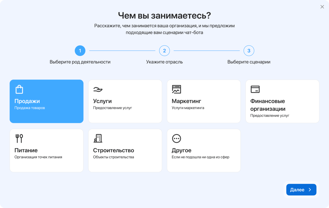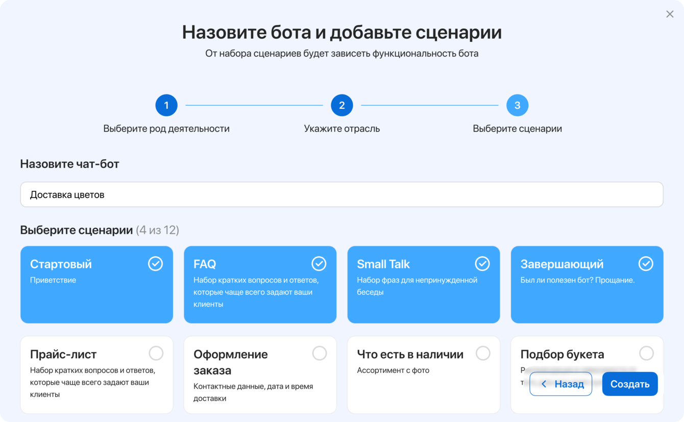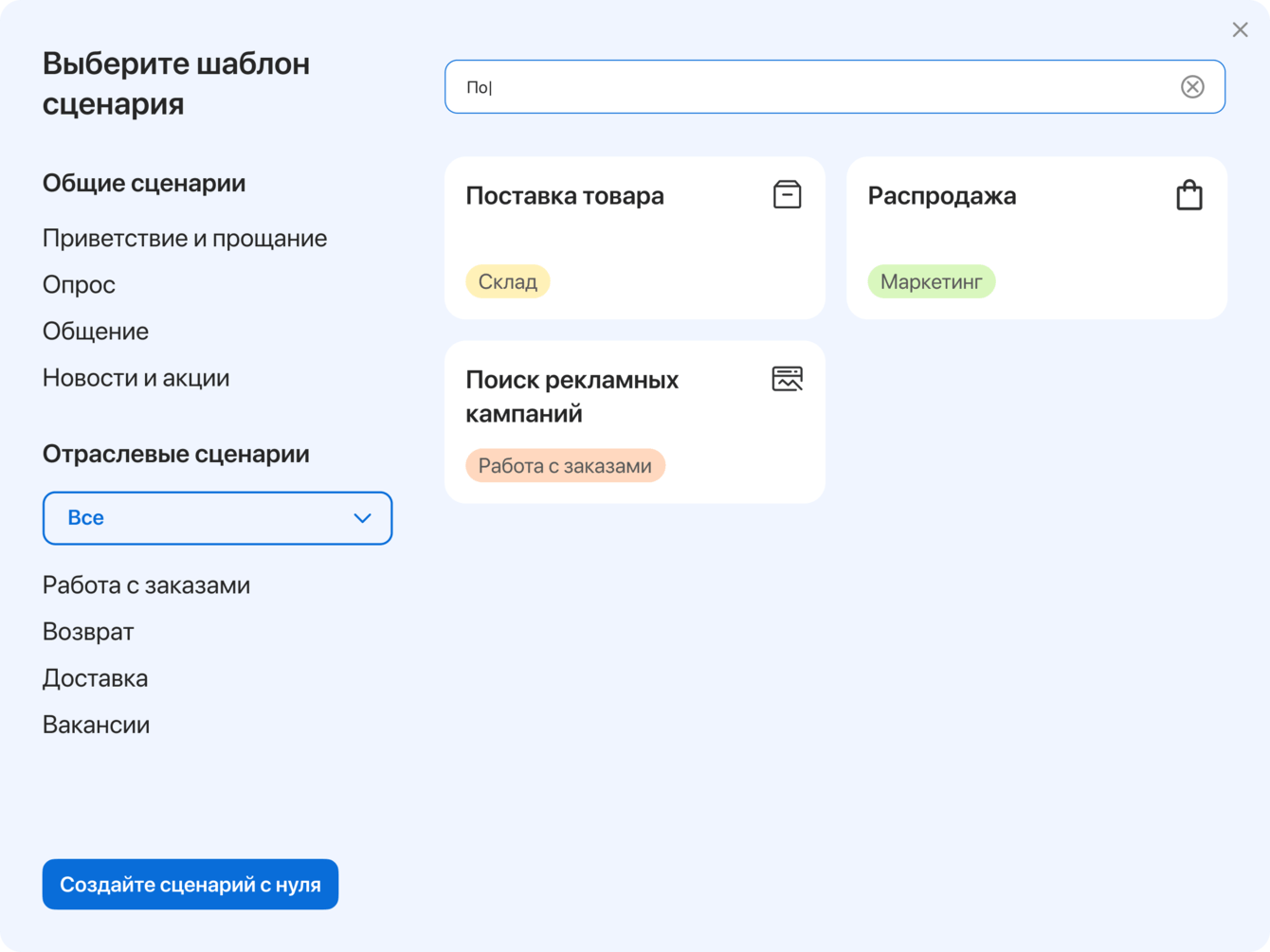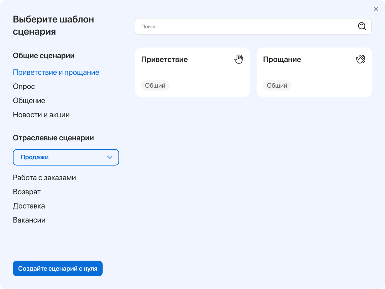 Шаблоны упрощают запуск: пользователь берёт готовое и донастраивает под себя.Даже если бизнесы разные, диалоги с клиентами часто повторяются. Поэтому мы добавили шаблоны. Например: