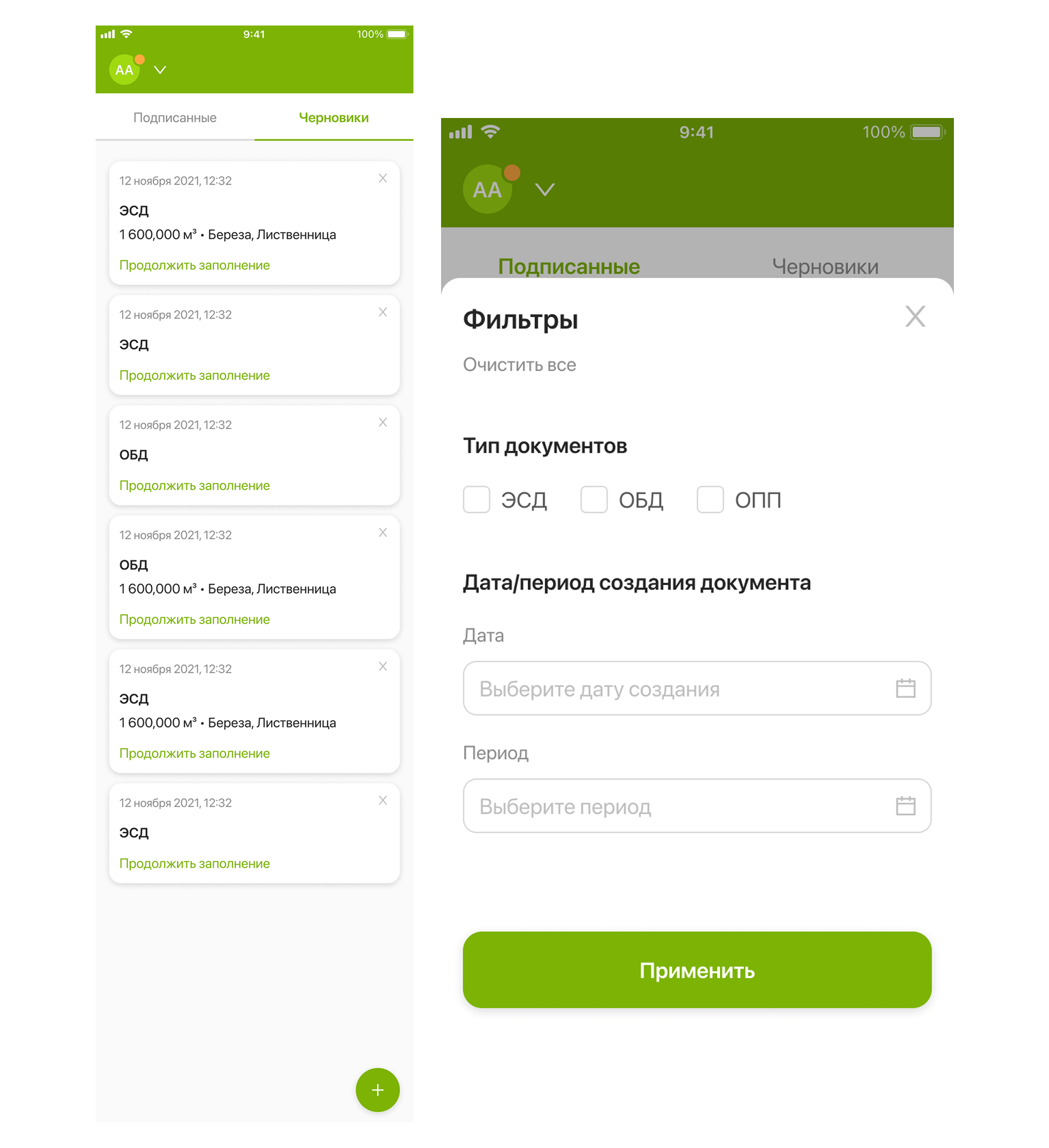 У одного пользователя в приложении могут быть десятки, а то и сотни документов разных типов. Мы предусмотрели фильтрацию по следующим аттрибутам: