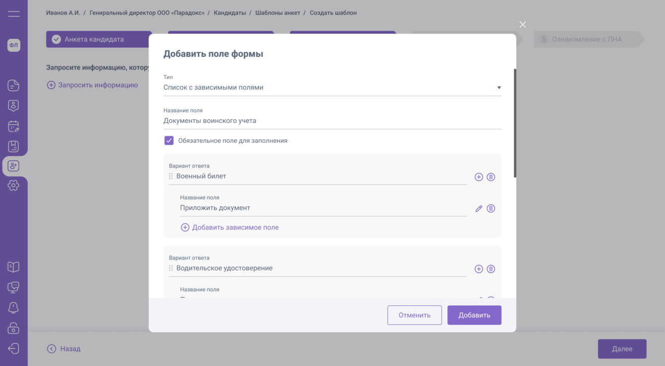 1. Модальное окно для добавления списка с зависимыми полями в анкету, заполняемую потенциальным кандидатом. Это список, в котором пользователь при добавлении поля (Название) указывает зависимые поля (Варианты ответа).