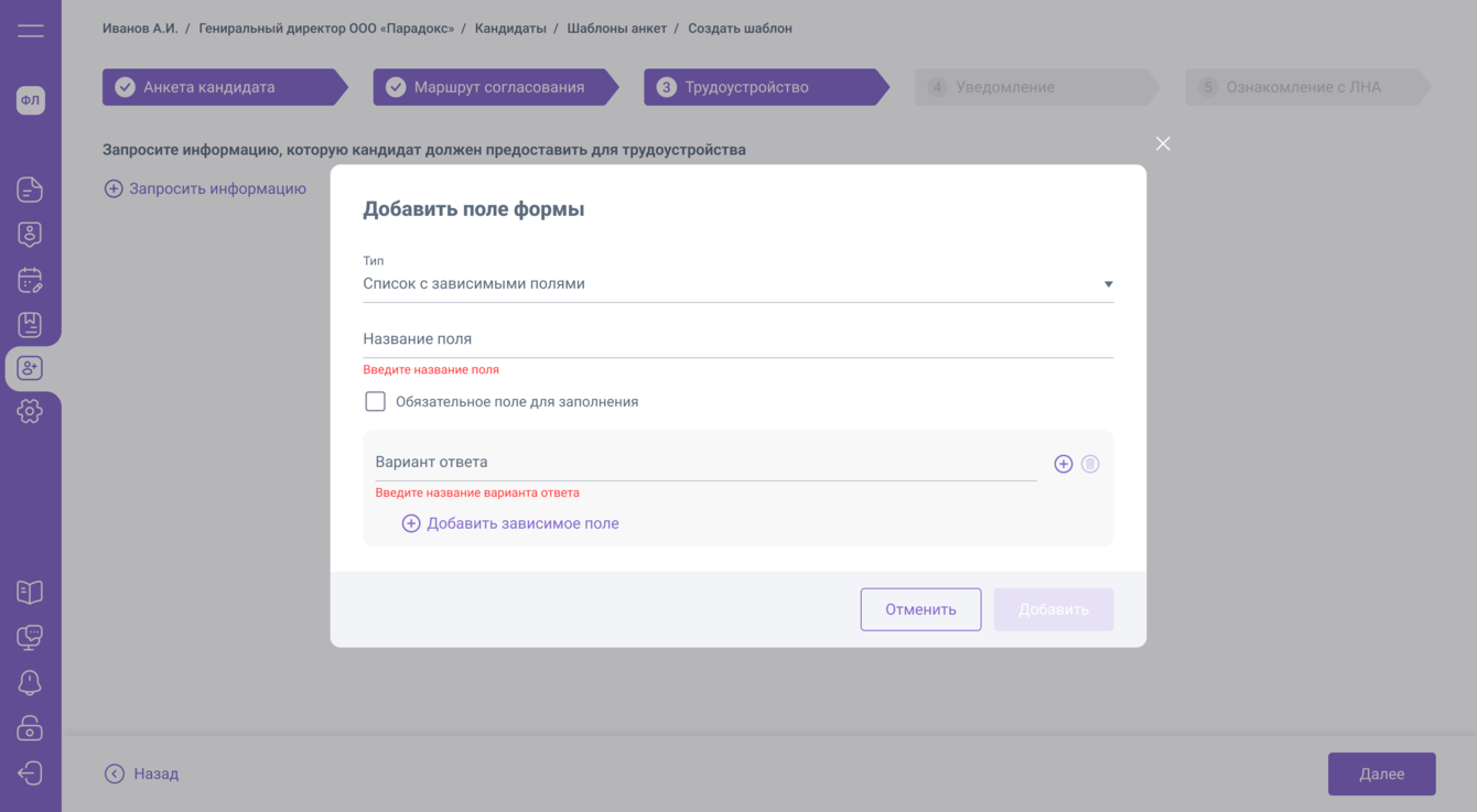 Настройка этапов найма. Добавление поля в анкету-2
