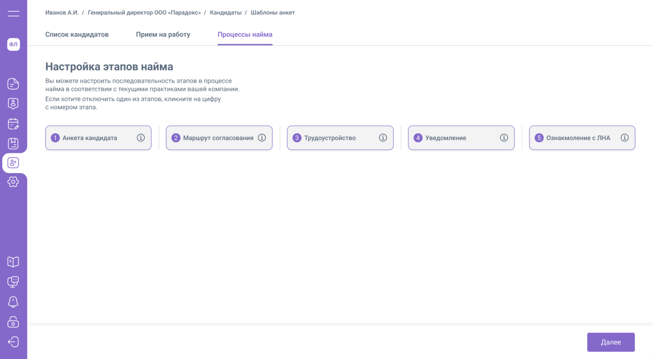 - настройка этапов прохождения процесса найма;