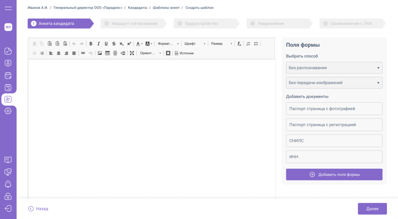 2. Экран создания анкеты кандидата. Здесь заказчику нужен был простой и удобный инструмент добавления в анкету вопросов и документов с возможностью перемещения полей для ответа по документу.