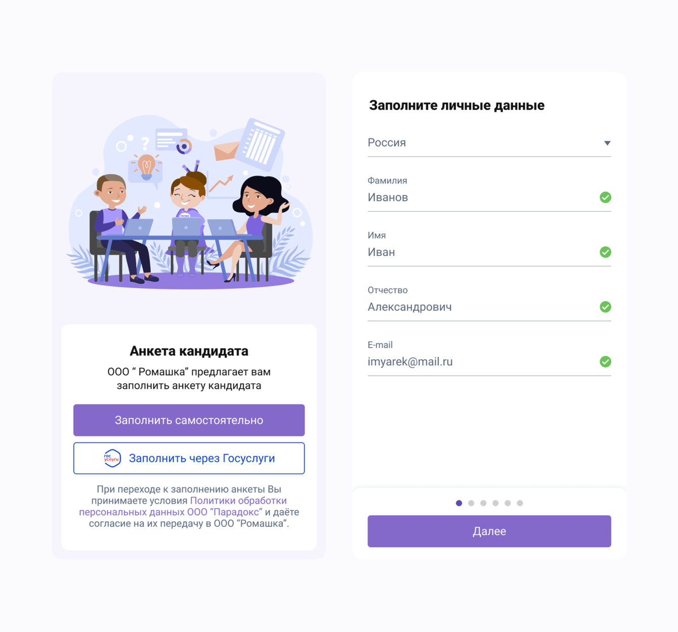 - заполнение анкеты кандидатом: