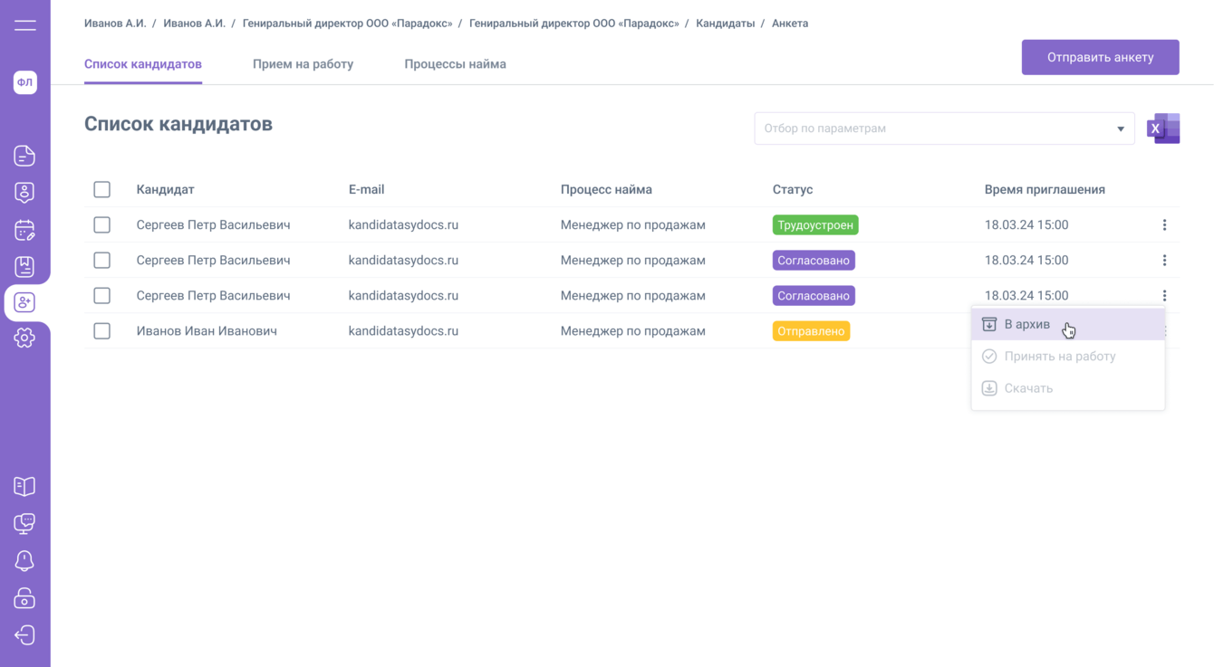 Отправить анкету кандидату