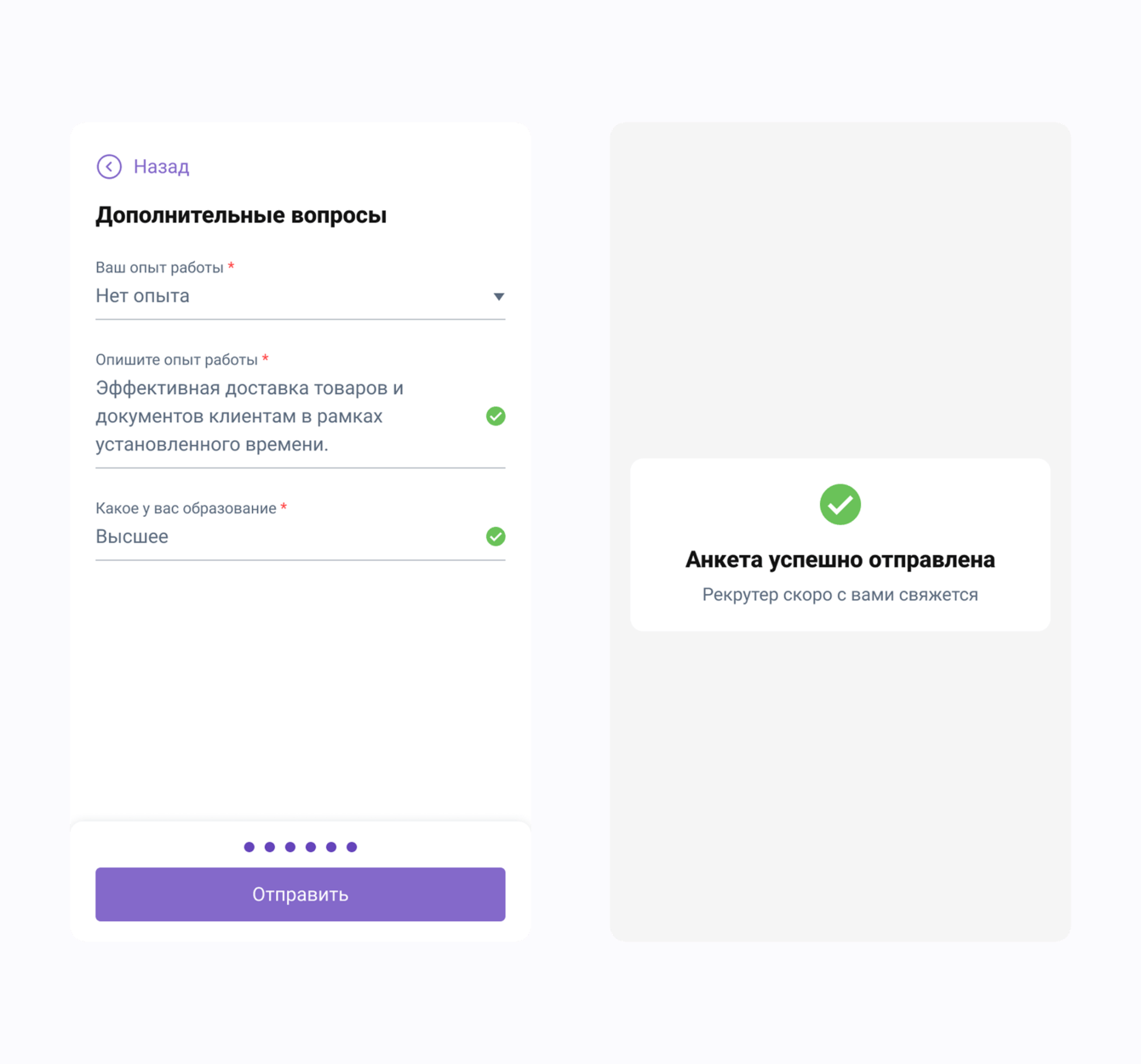 Анкета кандидата, мобильная версия. Заполнение данных, экран успеха