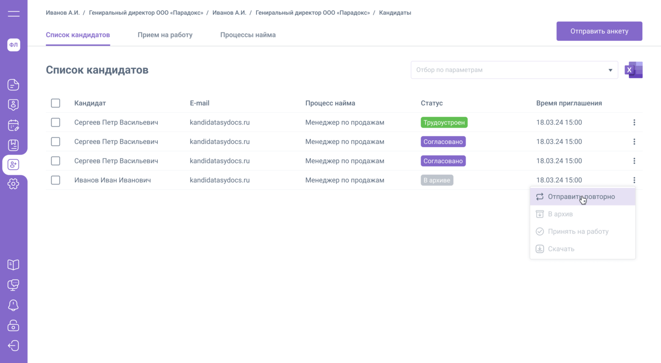 Список кандидатов. Отправить повторно