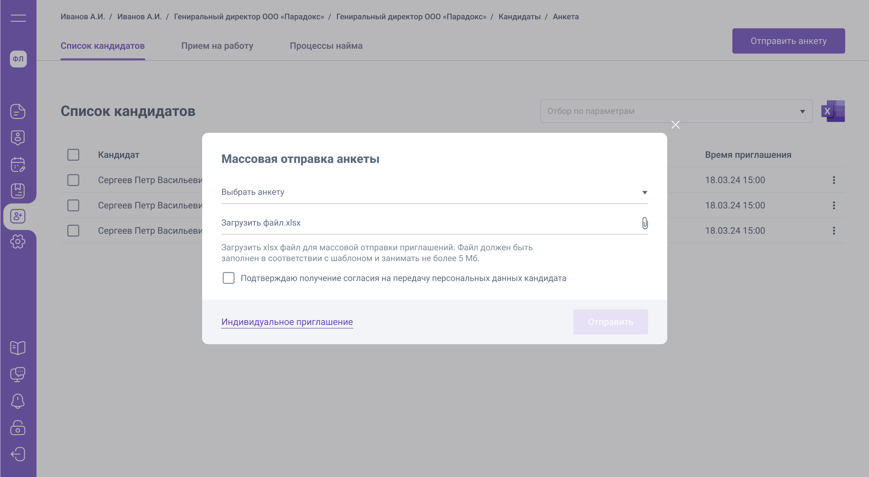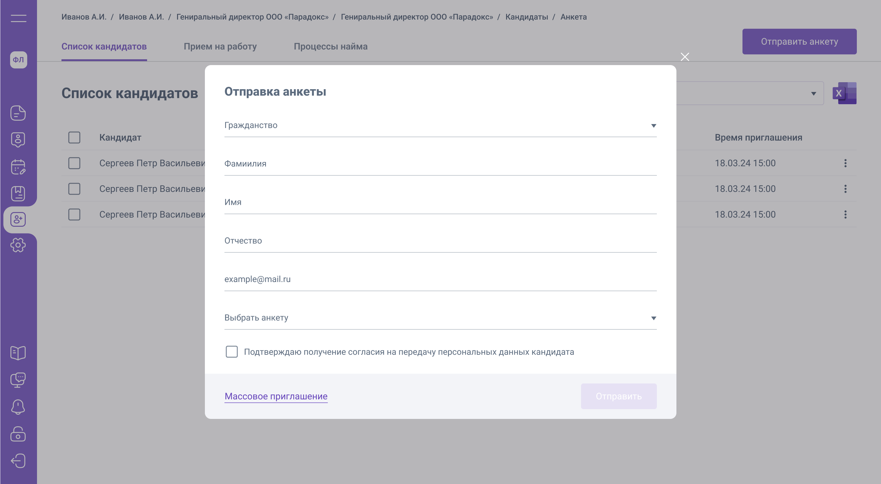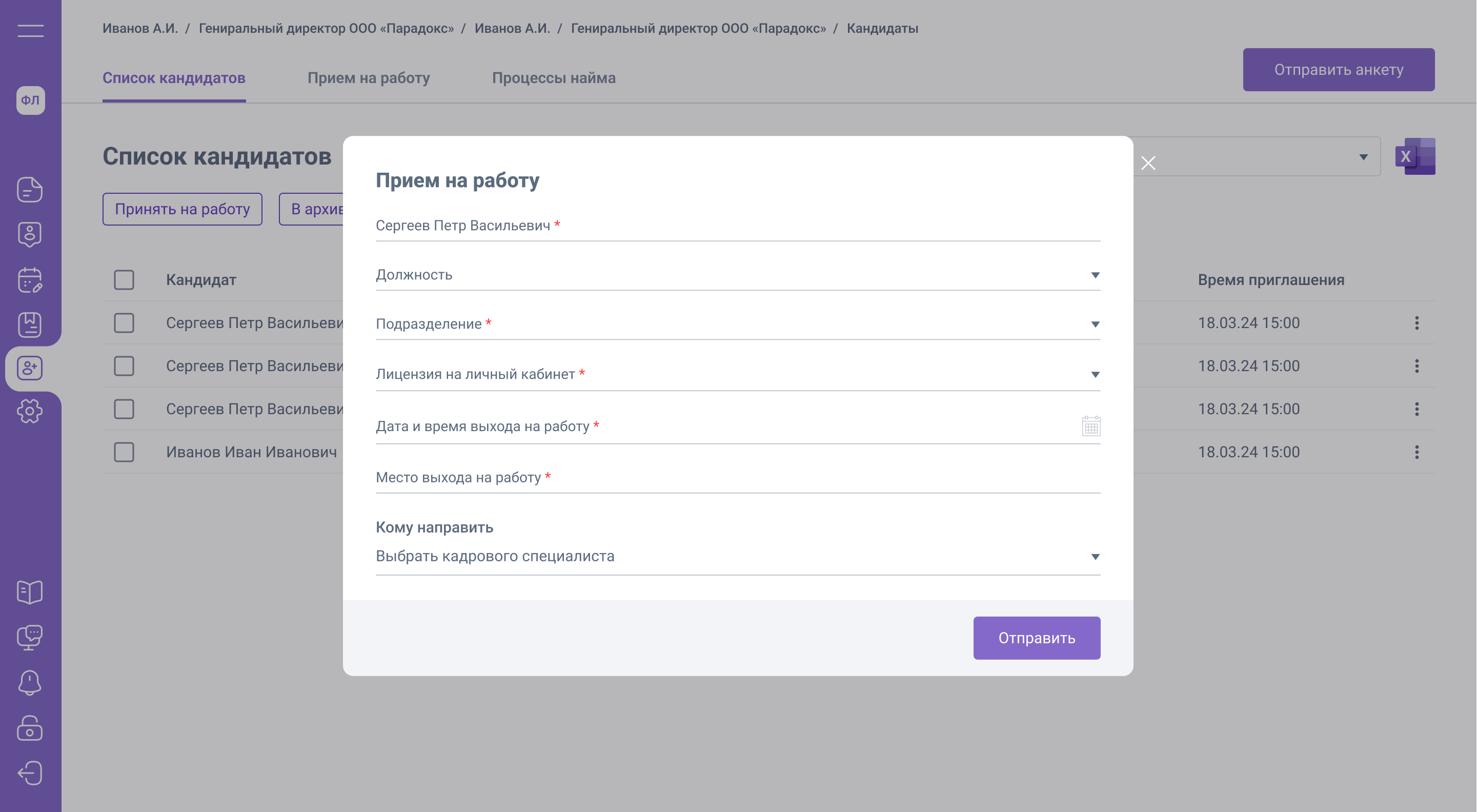 Отправить анкету кандидату