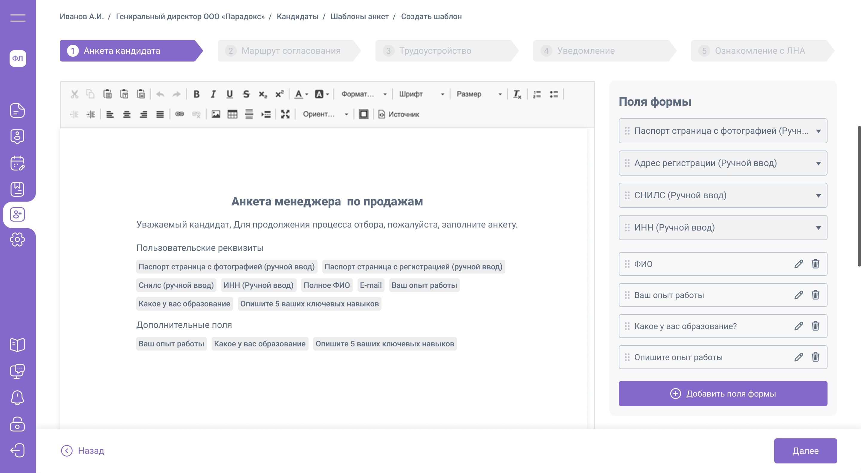 2. Экран создания анкеты кандидата. Здесь заказчику нужен был простой и удобный инструмент добавления в анкету вопросов и документов с возможностью перемещения полей для ответа по документу.