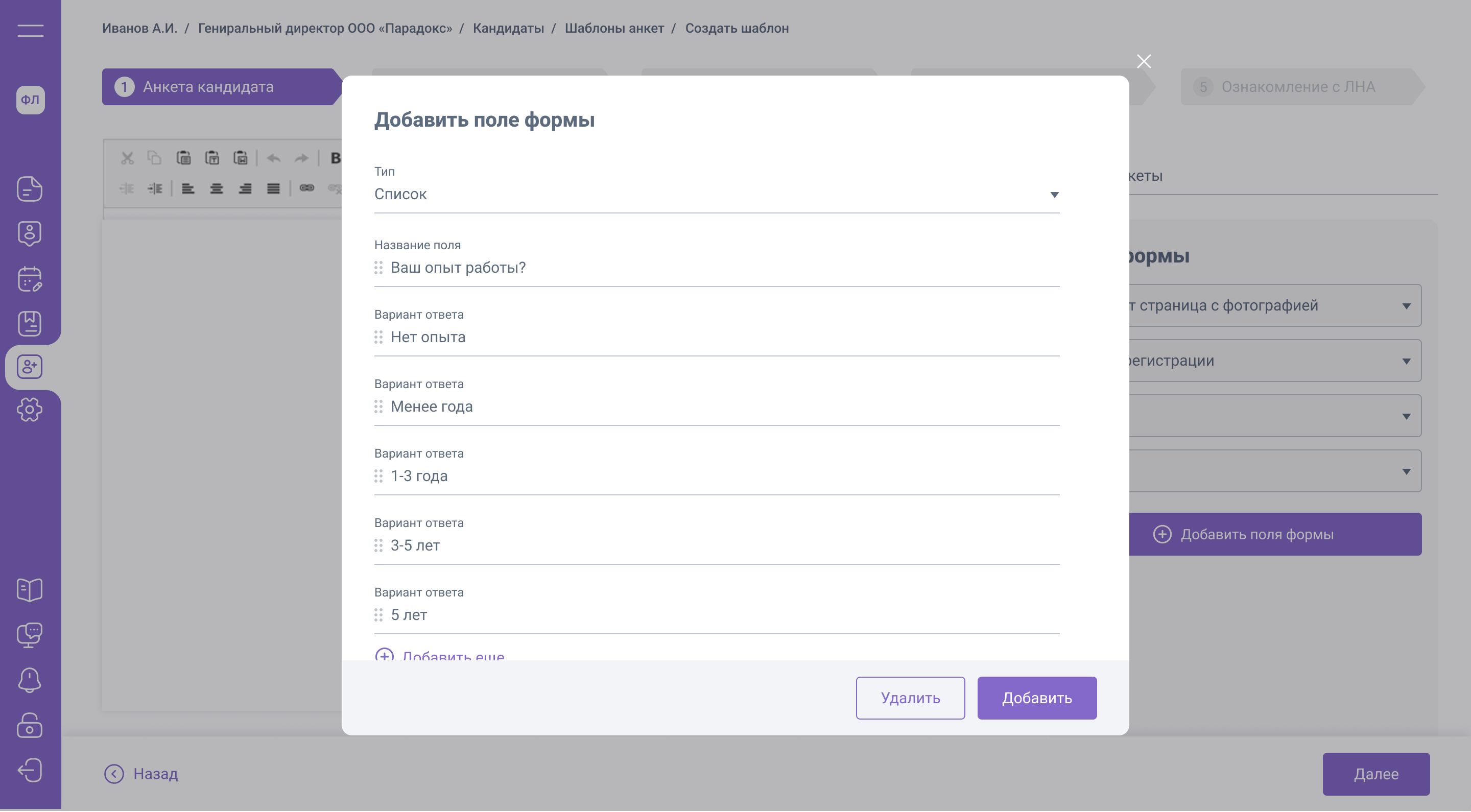 1. Модальное окно для добавления списка с зависимыми полями в анкету, заполняемую потенциальным кандидатом. Это список, в котором пользователь при добавлении поля (Название) указывает зависимые поля (Варианты ответа).