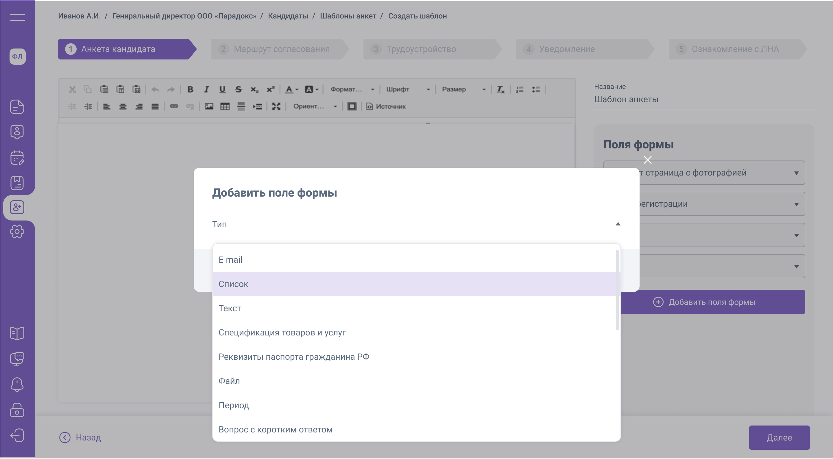 Настройка этапов найма. Добавление поля в анкету-2