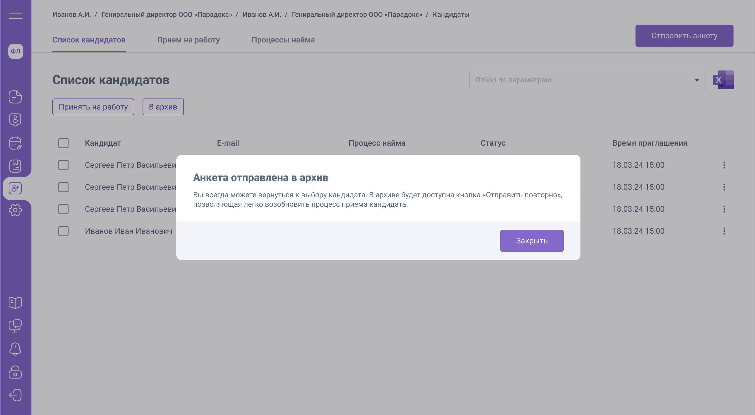 Список кандидатов. Отправить в архив