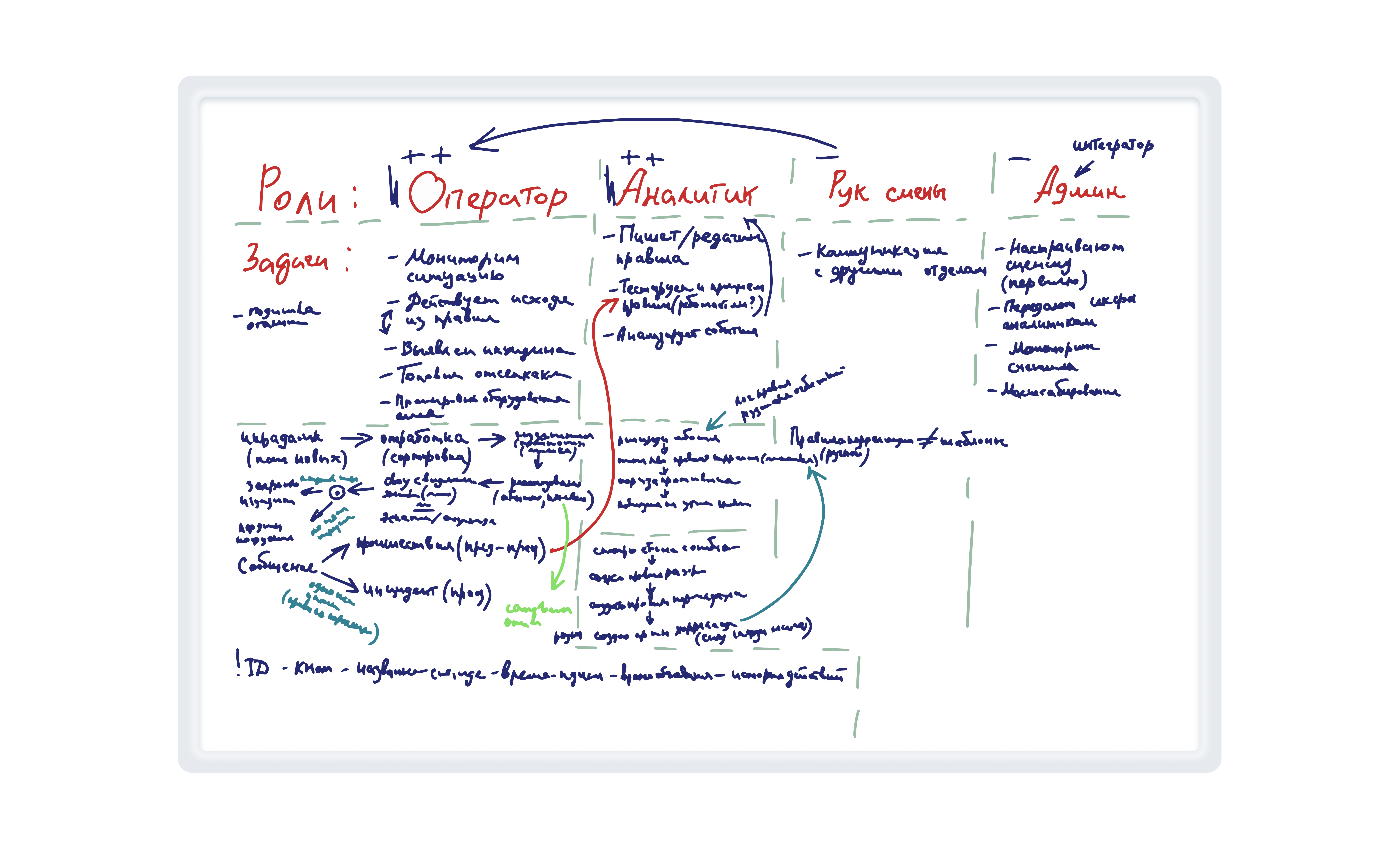 И сформулировали основные рабочие сценарии. Оператор и аналитик получили линейные истории своих рабочих процессов, а у администратора мы выделили функциональные обязанности: в жизни они редко выполняются в определенной последовательности.