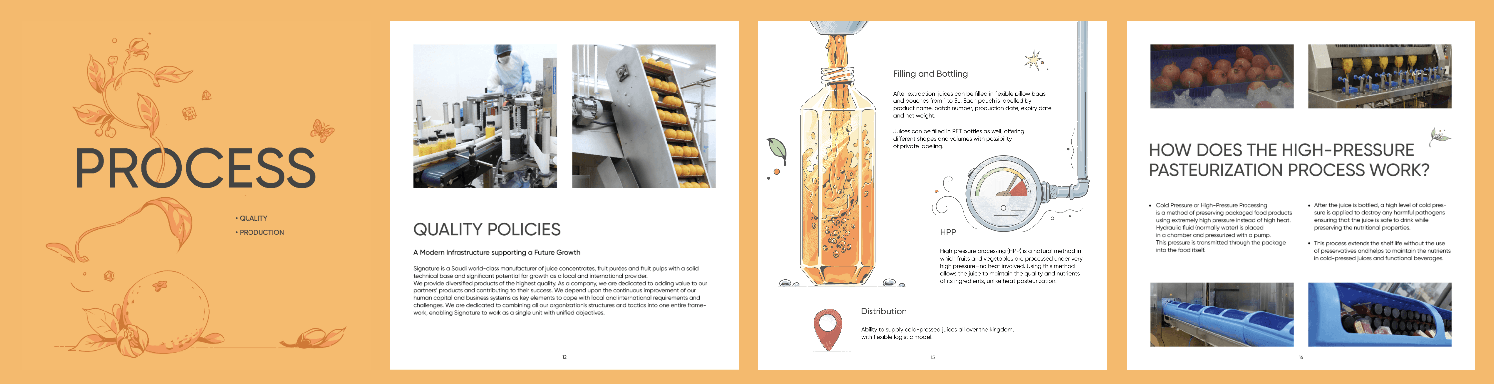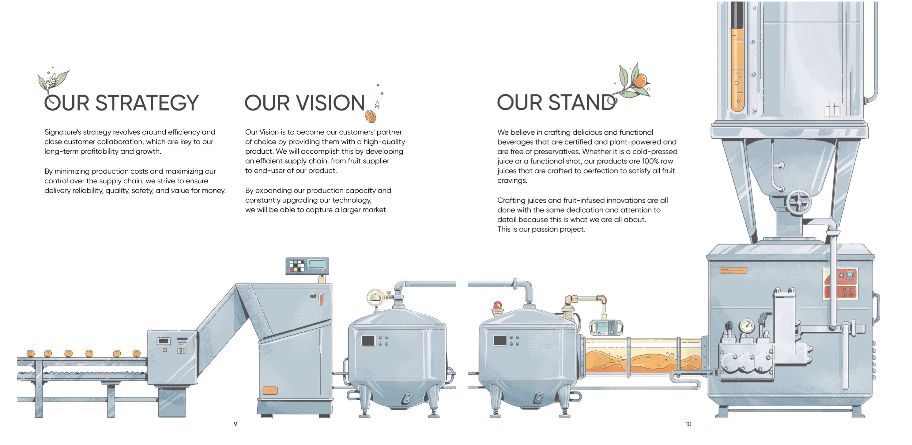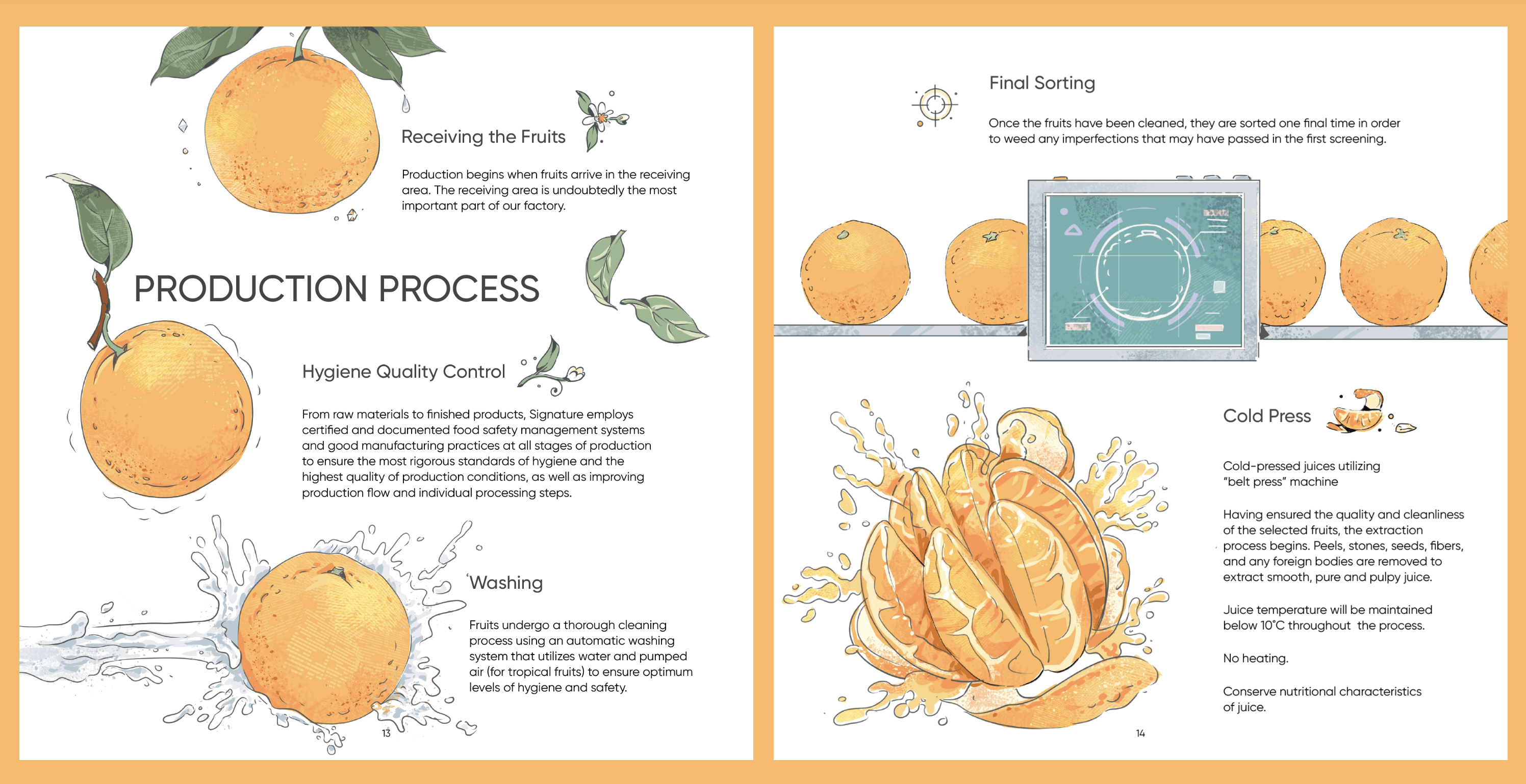 Мы сделали сложные процессы понятными с помощью иллюстраций. Разработали стиль, который органично вписался в фирменный образ Signature. Иллюстрации стали не украшением, а инструментом: они объясняют производство ясно и элегантно. Каталог собрал в себе разум и эмоцию. Фотографии показывают технологичность, иллюстрации упрощают детали, а вместе они вызывают доверие к бренду и желание попробовать сок или мороженое Signature. Это не просто дизайн, а история. Лаконичная, эстетичная, она превращает технику в рассказ и оставляет у партнёров и инвесторов яркое впечатление о бренд.