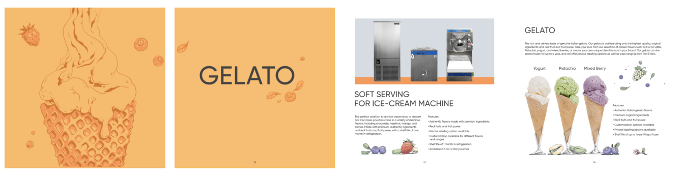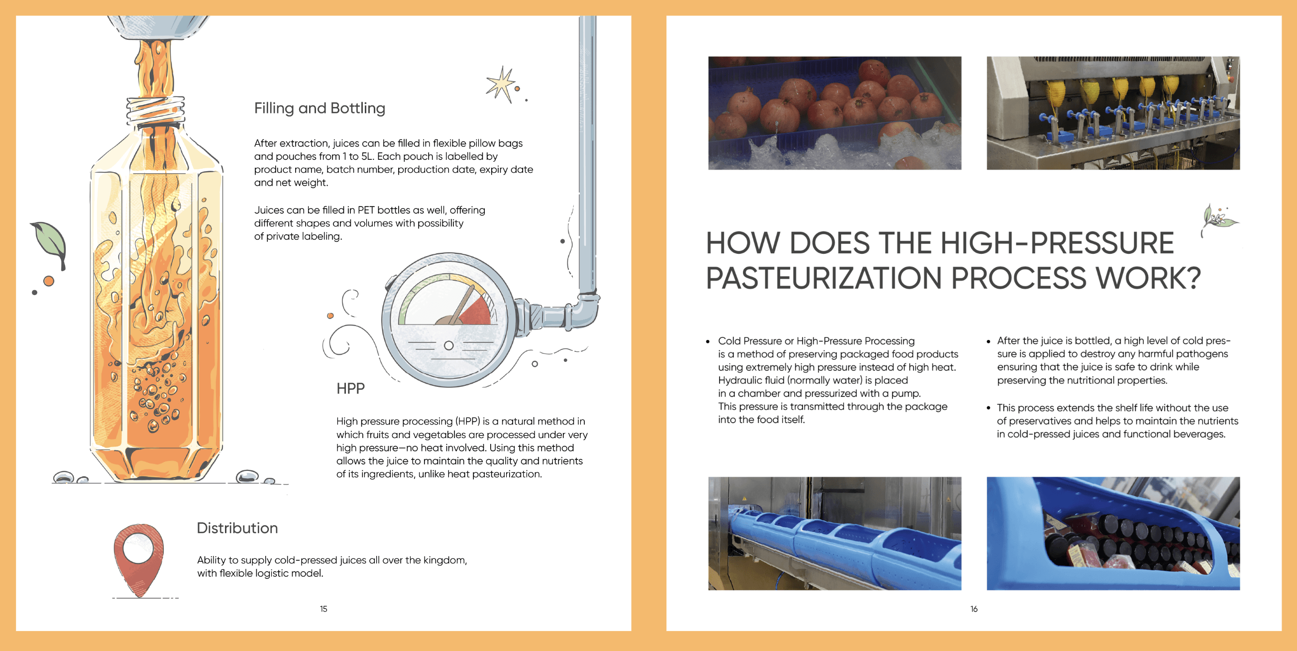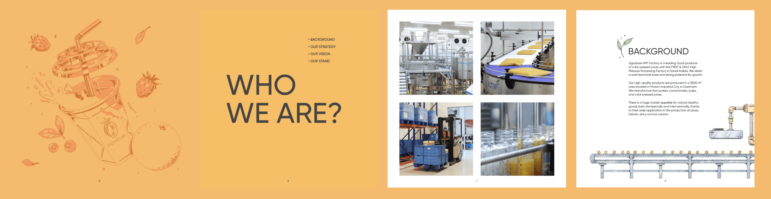 Мы сделали сложные процессы понятными с помощью иллюстраций. Разработали стиль, который органично вписался в фирменный образ Signature. Иллюстрации стали не украшением, а инструментом: они объясняют производство ясно и элегантно. Каталог собрал в себе разум и эмоцию. Фотографии показывают технологичность, иллюстрации упрощают детали, а вместе они вызывают доверие к бренду и желание попробовать сок или мороженое Signature. Это не просто дизайн, а история. Лаконичная, эстетичная, она превращает технику в рассказ и оставляет у партнёров и инвесторов яркое впечатление о бренд.