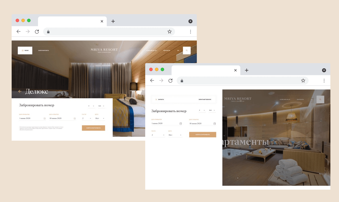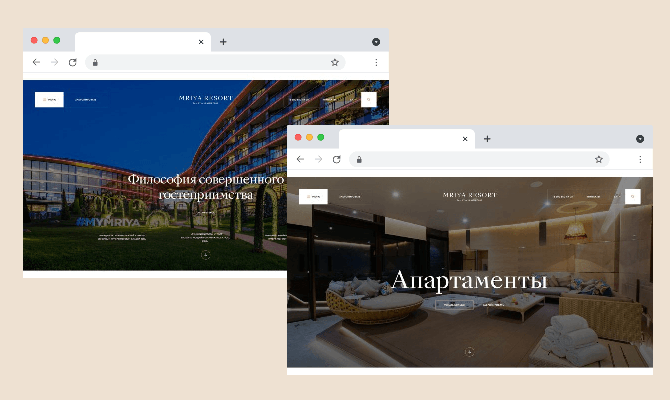 ✔ Прежний сайт комплекса Mriya Resort & Spa ассоциировался у многих клиентов исключительно с отдыхом премиального уровня, при этом более доступные предложения, которые есть в отеле, оказывались невостребованными, структура сайта была продумана не лучшим образом, из-за чего некоторые разделы практически не посещались потенциальными клиентами. Мы провели серьезное аналитическое исследование и выявили наиболее оптимальную структуру сайта, на основе которой построили дизайн-концепцию. В частности - данные метрики говорят о том, что 73% пользователей сайта предпочитают просматривать его со смартфона. Поэтому мы предложили заказчику акцентировать внимание на мобильной версии сайта и адаптивном дизайне.