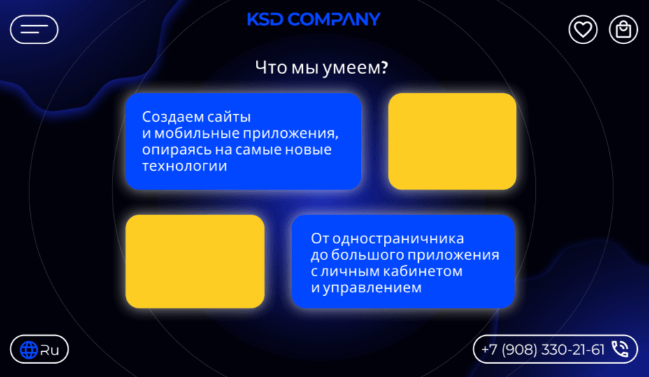 • Приветственный блок: Создание чистого и привлекательного вступительного экрана с краткой информацией о компании.