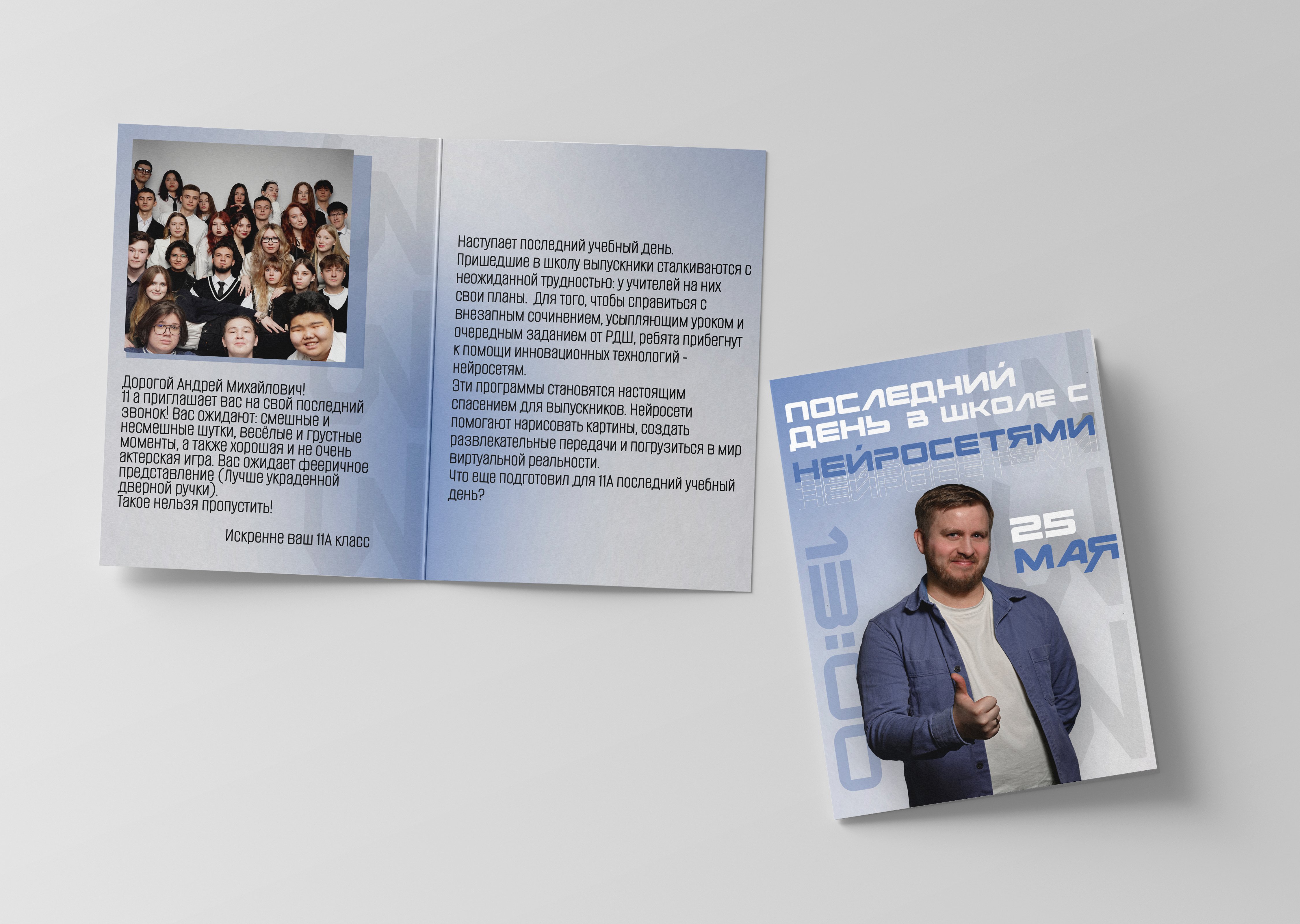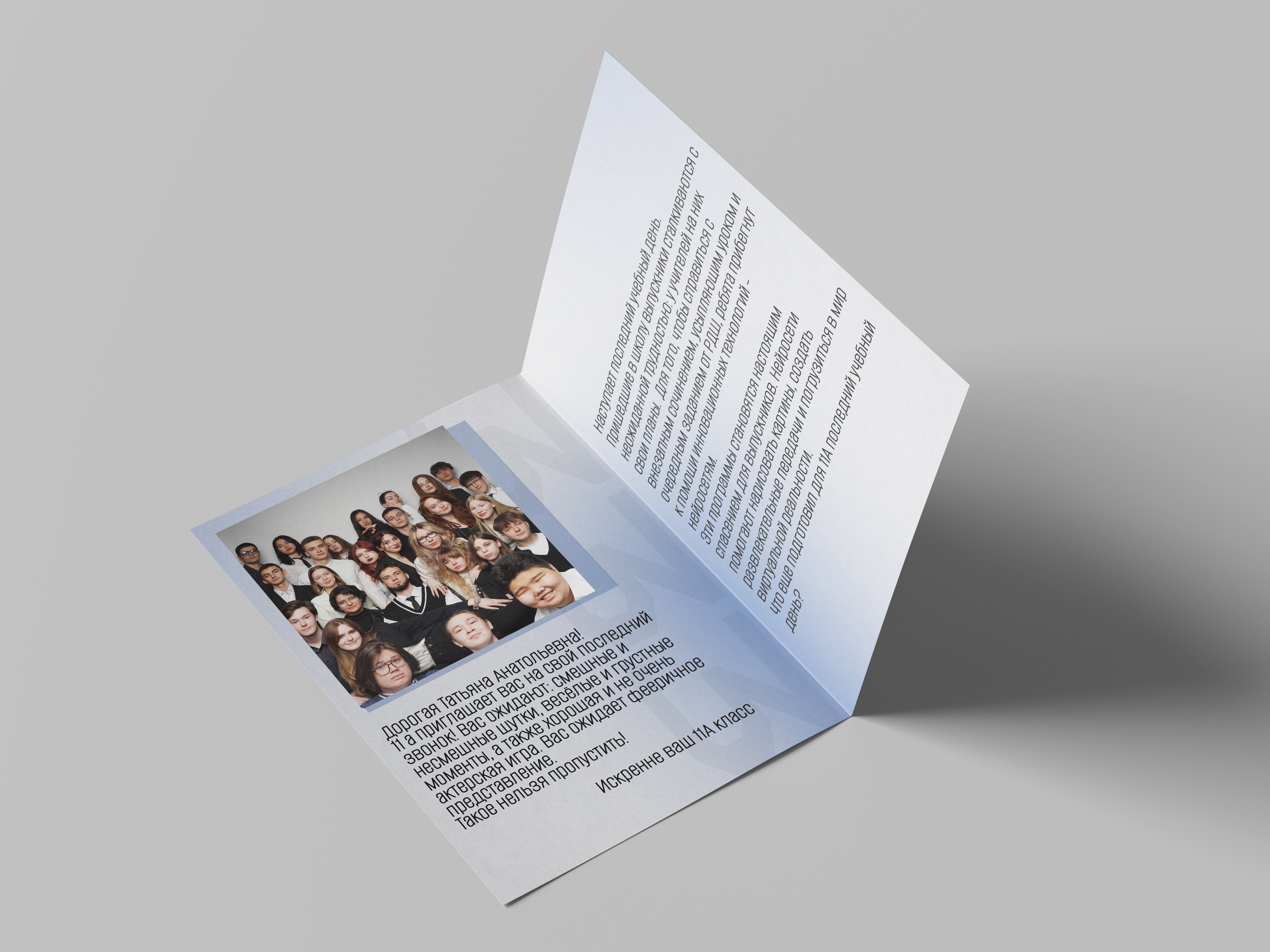 Была подобрана стилистика и концепция. Подобраны фотографии организаторов с фотосета. Подготовка макетов для печати в типографии. Далее в этой же стилистике были оформлены именные пригласительные буклеты.
