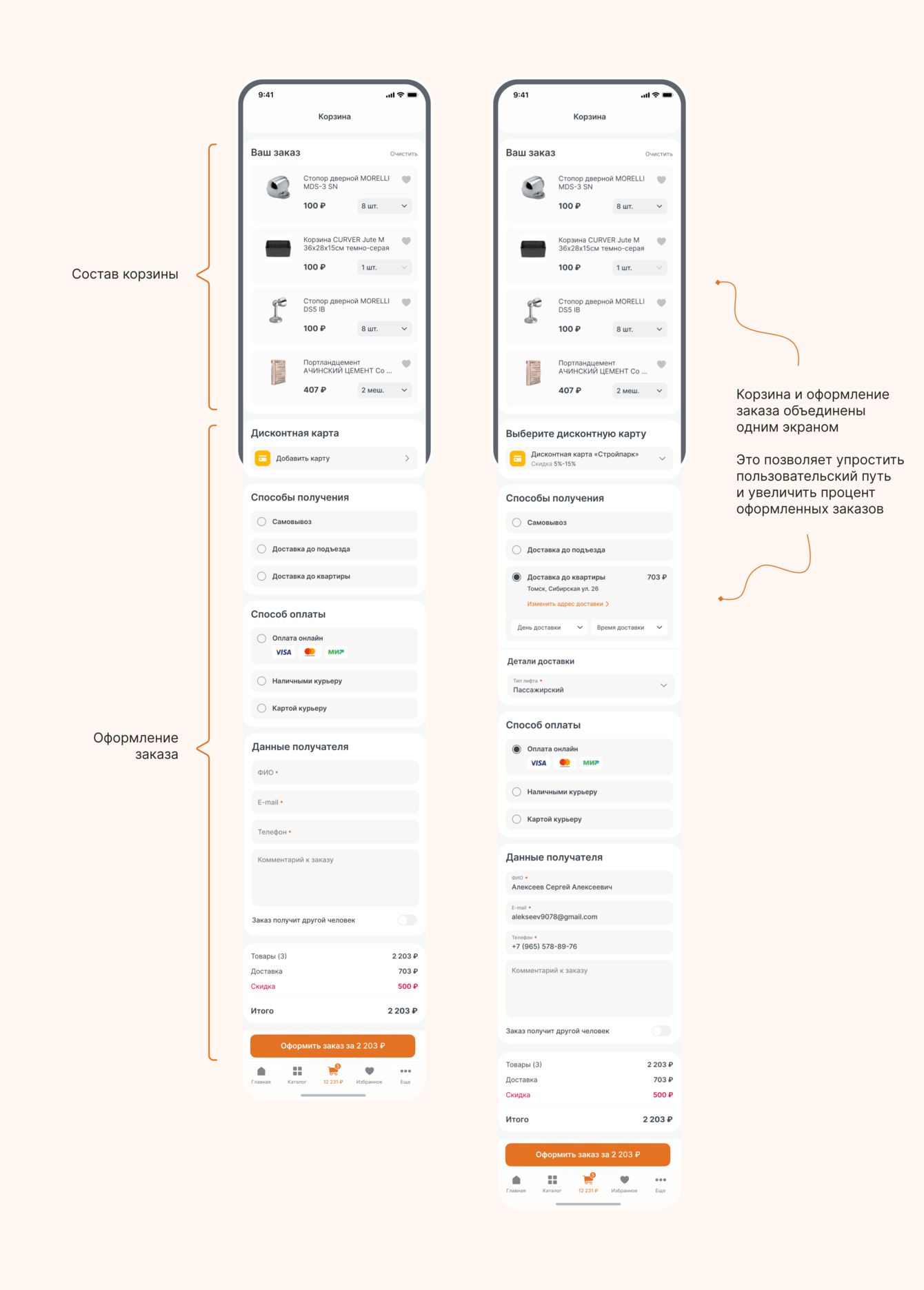 Эти два экрана мы решили объединить в один, для того чтобы упростить процесс оформления заказа. Из ранее реализованных проектов мы увидели, что данное решение увеличивает конверсию в заказ. При первом заказе пользователь последовательно заполняет все данные, не делаю дополнительных действий по переходу, а при повторном заказе все данные для пользователя будут уже предзаполнены и действия необходимые для оформления заказа сокращаются до нажатия на кнопку “Оформить заказ”.