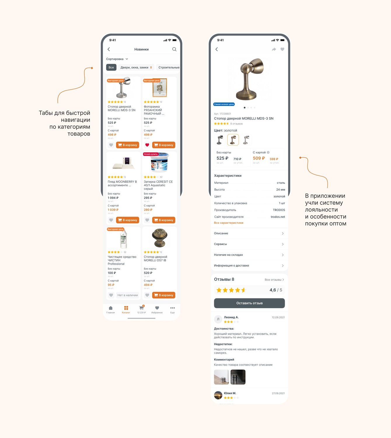 Каталог и карточка товара должна была “уметь” адаптироваться под очень разные виды товаров. От строительных материалов с различными характеристиками и торговыми предложениями, до электроприборов. Кроме этого, необходимо было реализовать возможность отображать аж до четырех видов цен, которые зависели от наличия у пользователя карты и типа покупки опт/розница.
