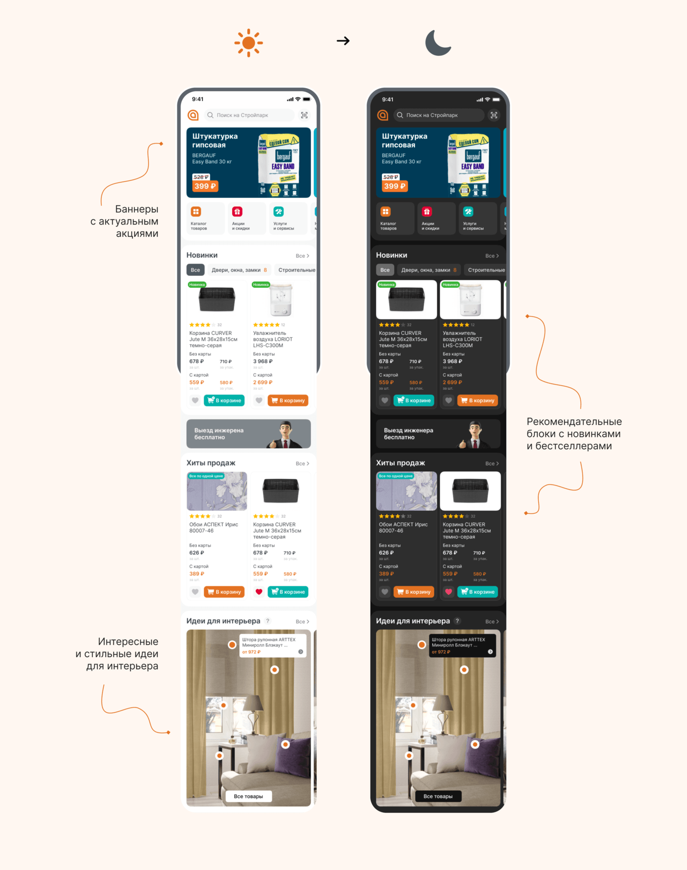 Благодаря правильному проектированию, структура экранов стала более дружелюбной, блоки последовательными и логичными. За прототипами мы перешли к дизайн-концепции. Минималистичная, аккуратная и понятная - это то, что мы хотели получить и получили. При этом нашлось место и ярким фирменным цветам, которые смогли правильно разбавить приложение. Дополнительно мы подготовили концепцию в темном цвете.
