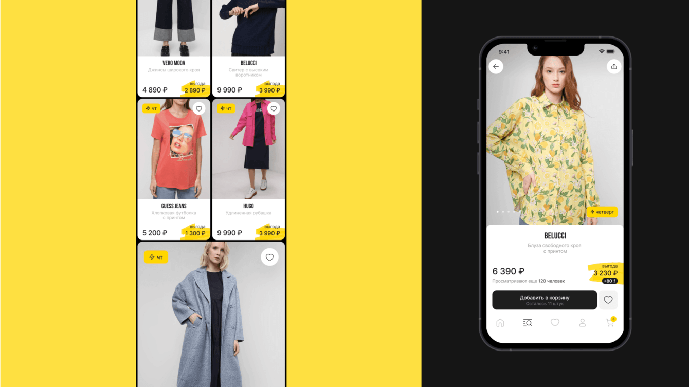 Основной слоган акции — «Покрасим цены в желтый цвет». Команда беты реализовала эту идею в итоговой концепции, выделив выгоду на карточка товарах и используя различные декоративные элементы, похожие на подчёркивание товаров в бумажном каталоге карандашом/маркером. В рамках редизайна приложения была переработана главная страница — добавлены элементы в новом стиле: об акции, подборки, статьи, топовые товары и т.д, а также добавлены удобные фильтры, сортировка и настройка «сумасшедших дней» под себя.