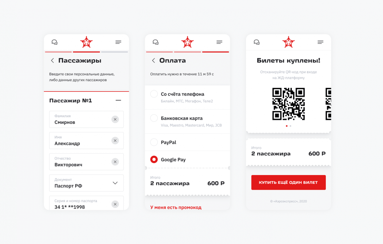 — Процесс покупки билета разделён на три этапа: данные о поездке, данные о покупателе, данные о пассажирах.