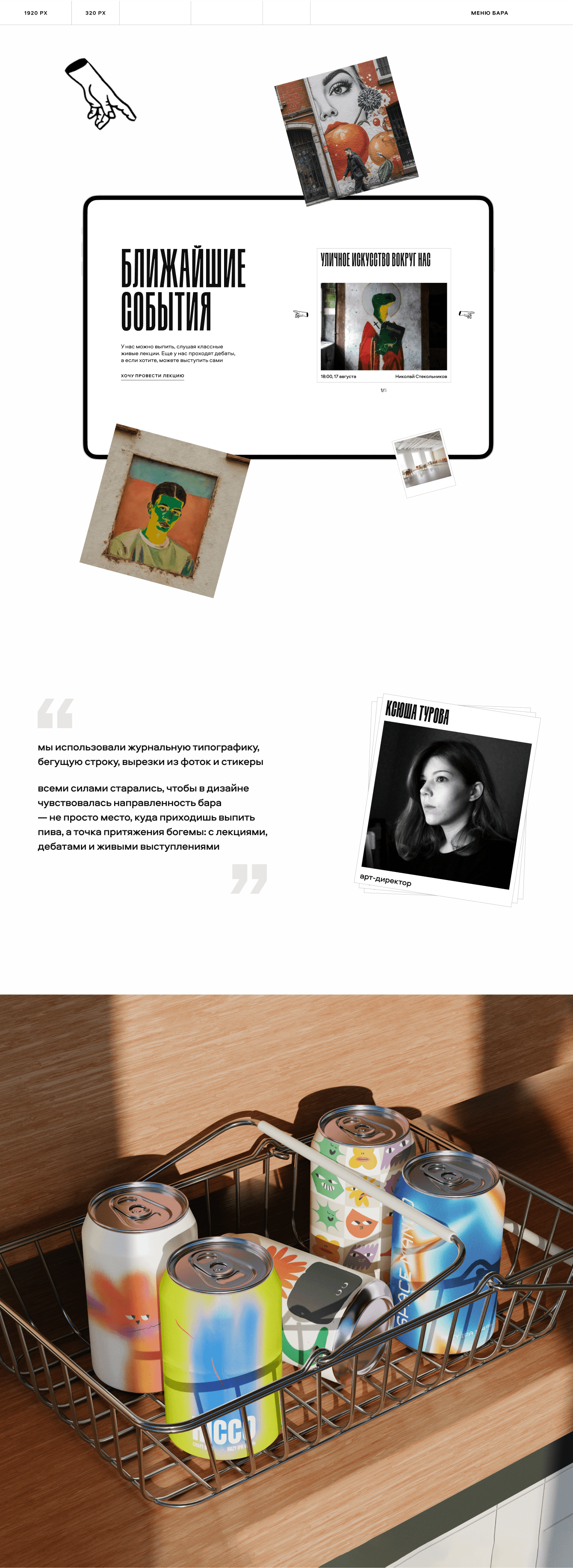 — С учётом локации — центр Петербурга, но без активного пешеходного трафика — сделали ставку на выразительный сайт. Благодаря запоминающемуся дизайну, бар стал находкой для новых гостей: именно сайт привлекает внимание и мотивирует посетить место.