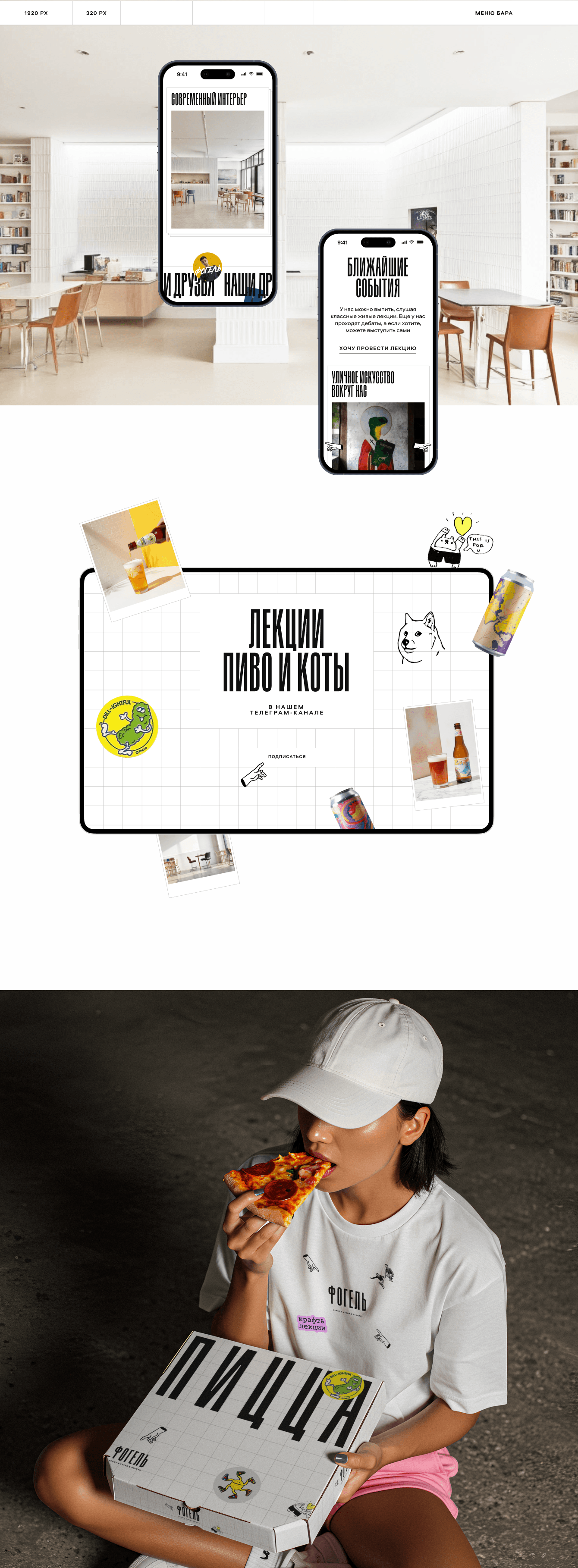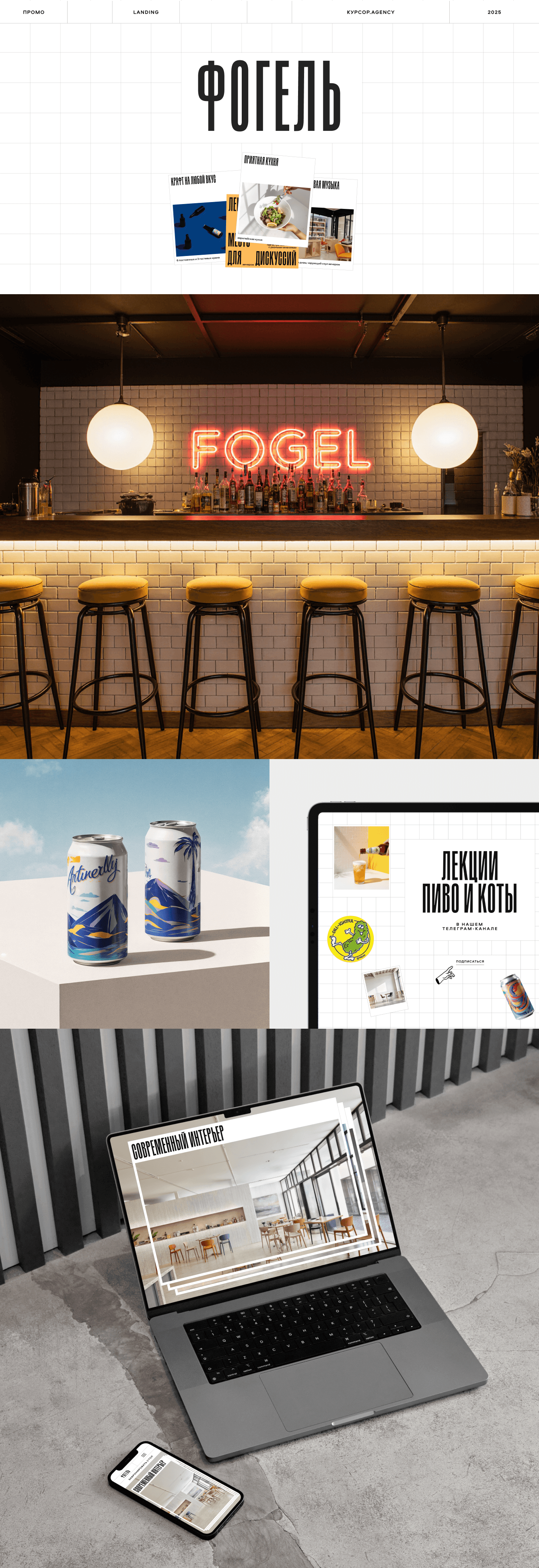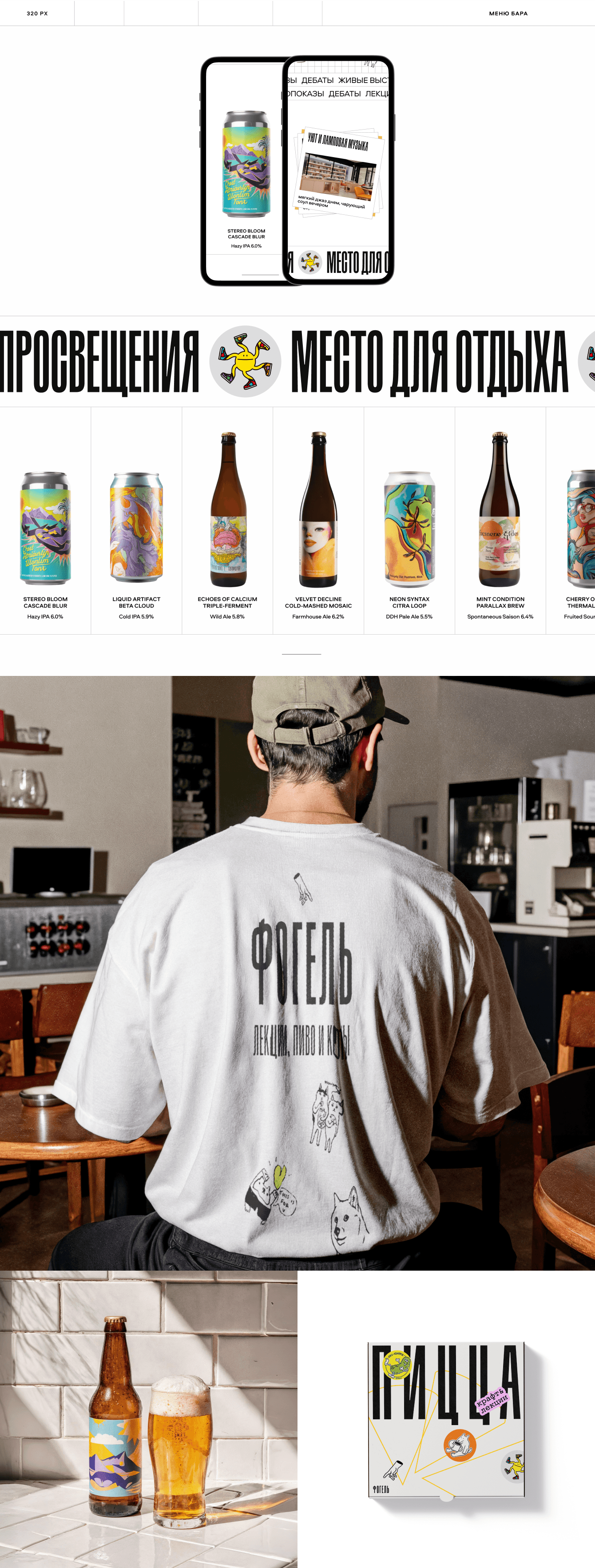 Fogel — не просто бар, а место, которое формирует вокруг себя коммьюнити: здесь проходят лекции, дебаты, можно самому выйти и рассказать о чём угодно. Атмосфера живая и самобытная — её и хотелось передать в дизайне.
